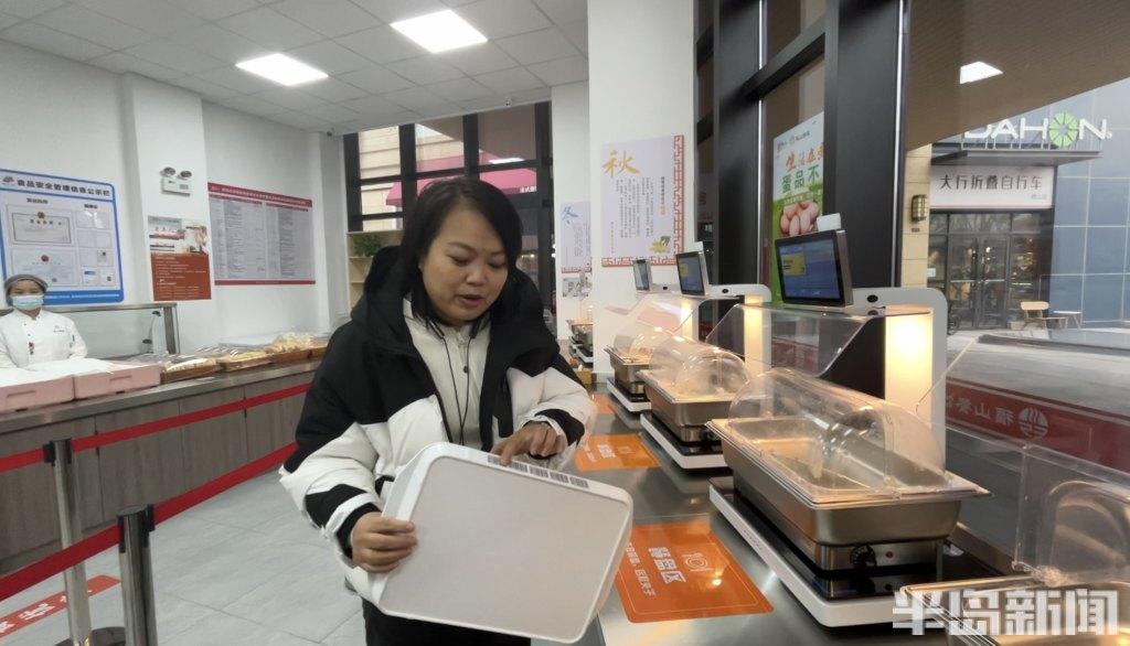 “智能餐厅主要依托智能餐盘,餐盘上有条形码,打菜时老人将餐盘往盛装不同菜品的加热盘前扫一下,就可以自动显示老人的餐盘码。然后老人在取餐时,系统会通过盛装菜品的加热盘内菜量的总重量变化,来计算老人用勺取餐的重量。上方的屏幕可以清楚地看到勺内的重量及价格,这样就能够让老人自由控制取餐的克重。这是‘前减式’的计算模式。”市北区民政局养老科科长于亚玫介绍,餐厅从10月30日营业以来,深受老年人欢迎。“通过这种方式老年人能够自主选择、自由打餐、精准核算,还可以科学分流,老人不会再挤在同一个菜品前。”