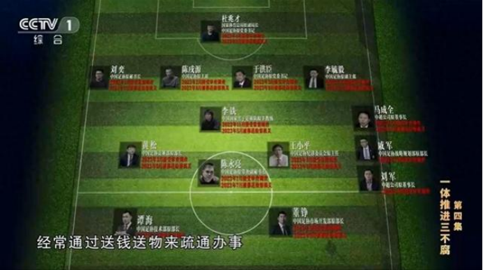 在专题纪录片中,央视官方也“整活”了一把——将部分涉案人员分布于足球场上,11名主力+3名替补,阵型为“442”。守门员为杜兆才;四名后卫为陈戌源、刘奕、于洪臣、李毓毅;单后腰李铁;三中场为黄松、陈永亮、王小平;前锋为谭海、董铮;替补席三人为马成全、戚军和刘军。