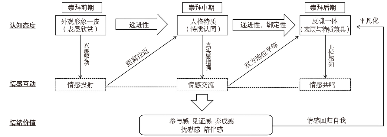 心理学认为,情感互动是个人对其喜好人物的社会认同和情感依恋,情感互动具有情感倾向性。弗洛姆(Erich Fromm)认为情感互动是一种对幻想中杰出人物的依恋,这种幻想常被过分强化或理想化。埃里克森(Erik H. Erikson)将情感互动理解为个体将儿童时期对父母的养育式依恋转移到青少年时期对异性的浪漫式依恋的一种表现。国外研究者对情感互动动机进行研究,依照弗洛伊德(Sigmund Freud)的精神分析理论,青少年期的情感互动源自个体的精神分割需求,青少年需要认同特定的偶像来强化自我的力量[2]。在关于情感互动模式的相关研究中,岳晓东等学者提出情感互动的两种模式:一是基于偶像外形的表层情感互动,二是基于偶像人格特质的特质情感互动。前者将偶像理想化、浪漫化和绝对化,突出欣赏其外在形象魅力,而后者则将偶像相对化、理性化和平凡化,突出欣赏其人格特质,采取何种模式将直接影响到青少年的偶像认同与依恋程度[3]。