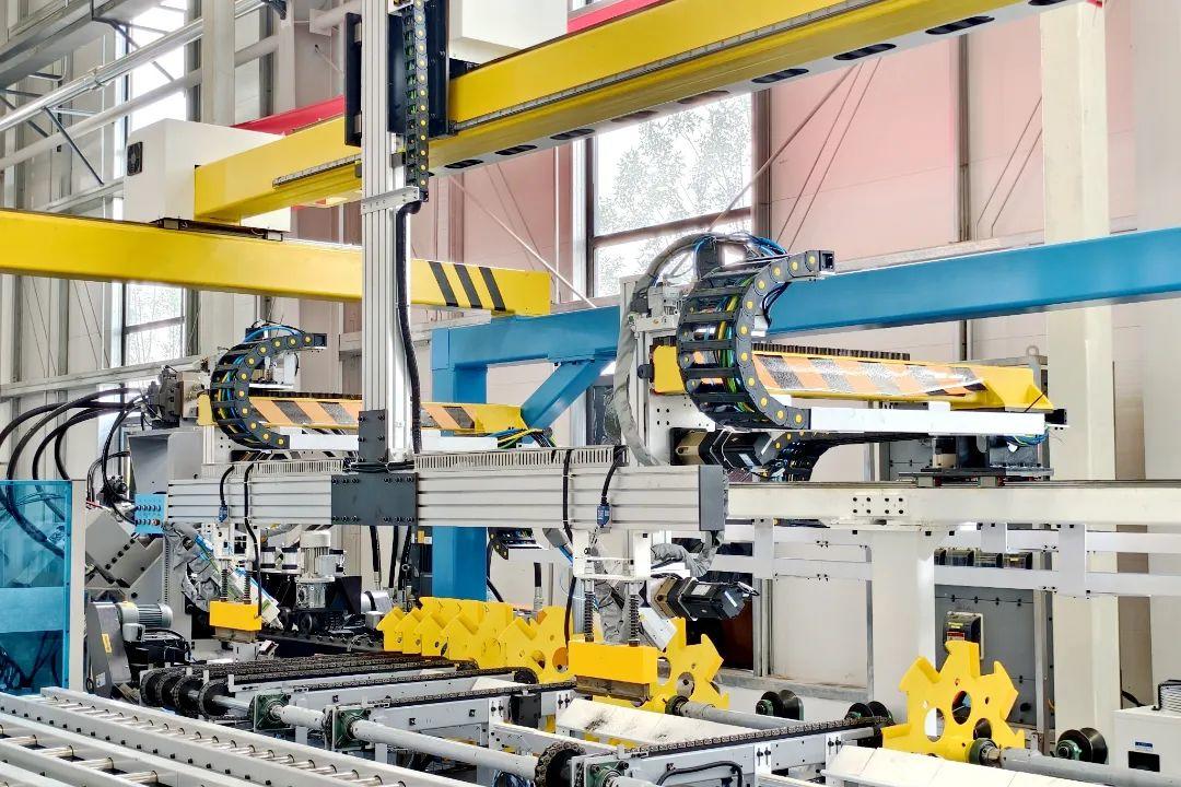 该装置主要解决了同类角钢自动加工生产线加工节拍慢,生产效率低的问题。通过使用180°机械翻转装置,取代磁吸手抓翻转机构,结构及动作简单,节拍紧凑,有效避免了磁吸手抓在抓取过程中可能出现的各种问题。利用四轴双端激光切角机进行自动切角加工,实现了双端并行切角加工,极大提高了切角加工效率。通过应用CAD解析软件与上位机系统,打通全程生产信息流,实现从原材料到成品整个环节的实时监控以及下料信息集中输出。