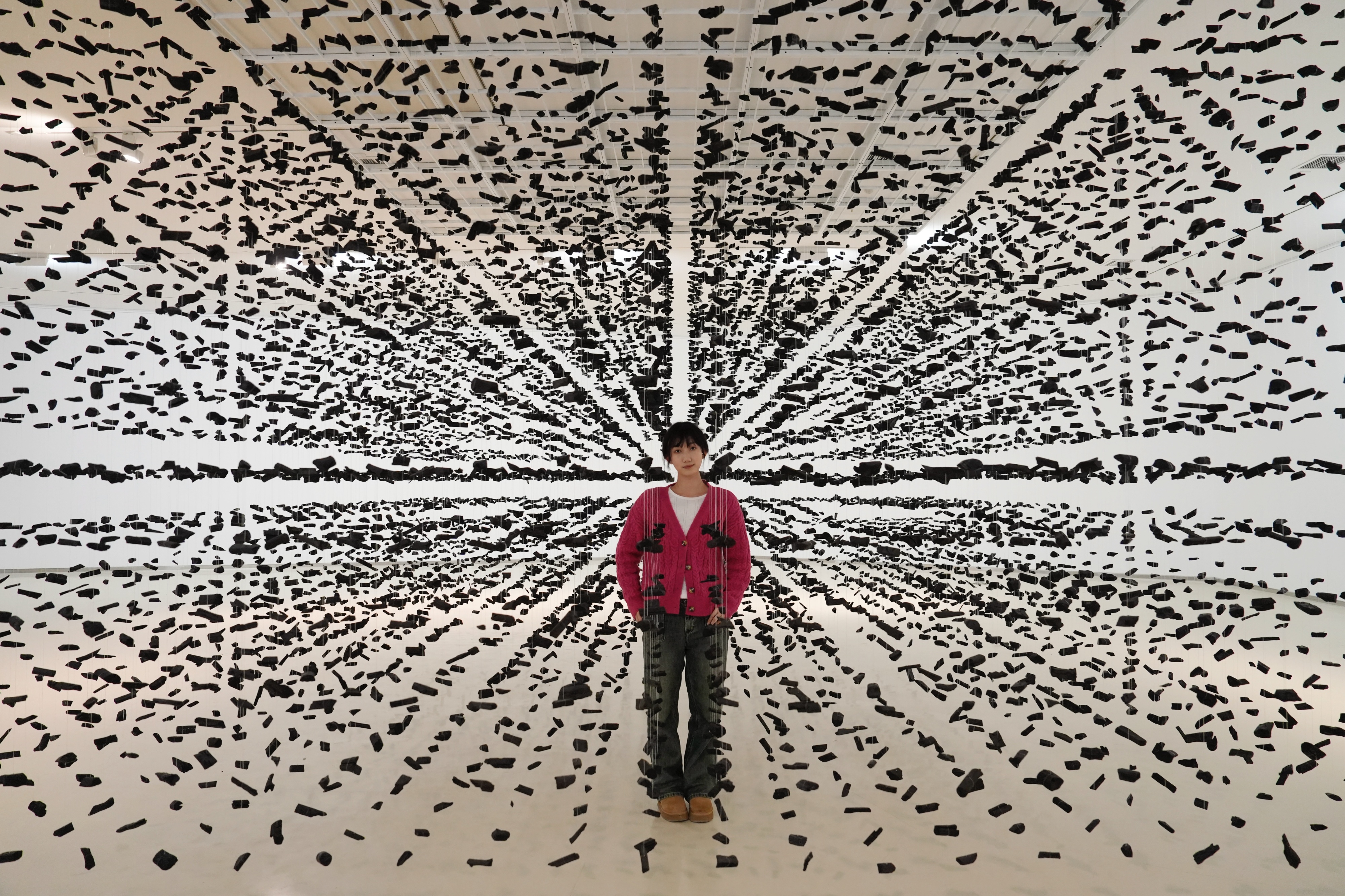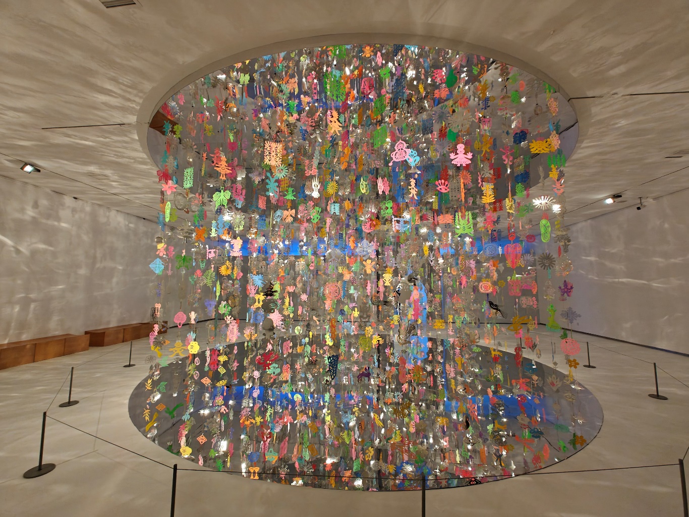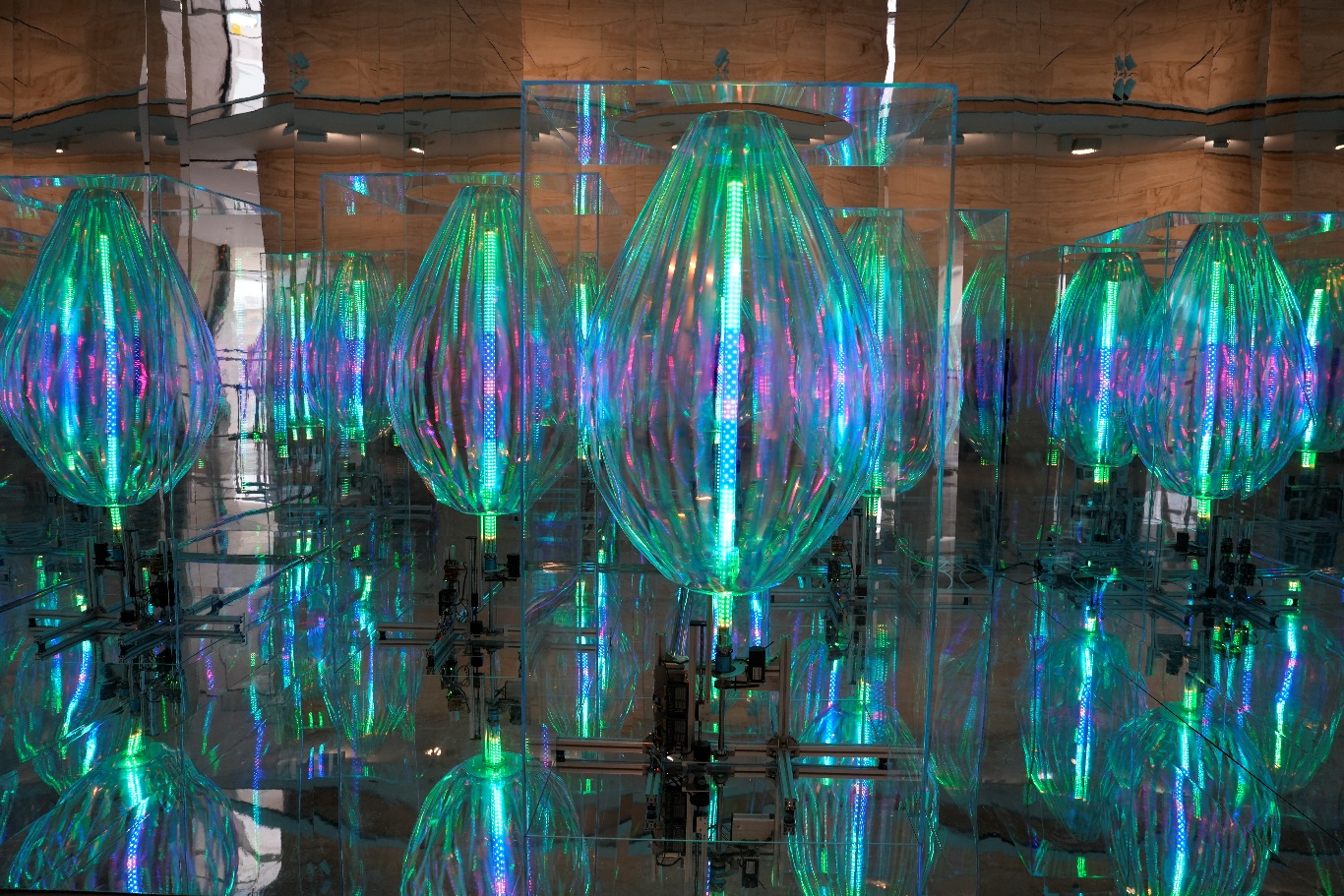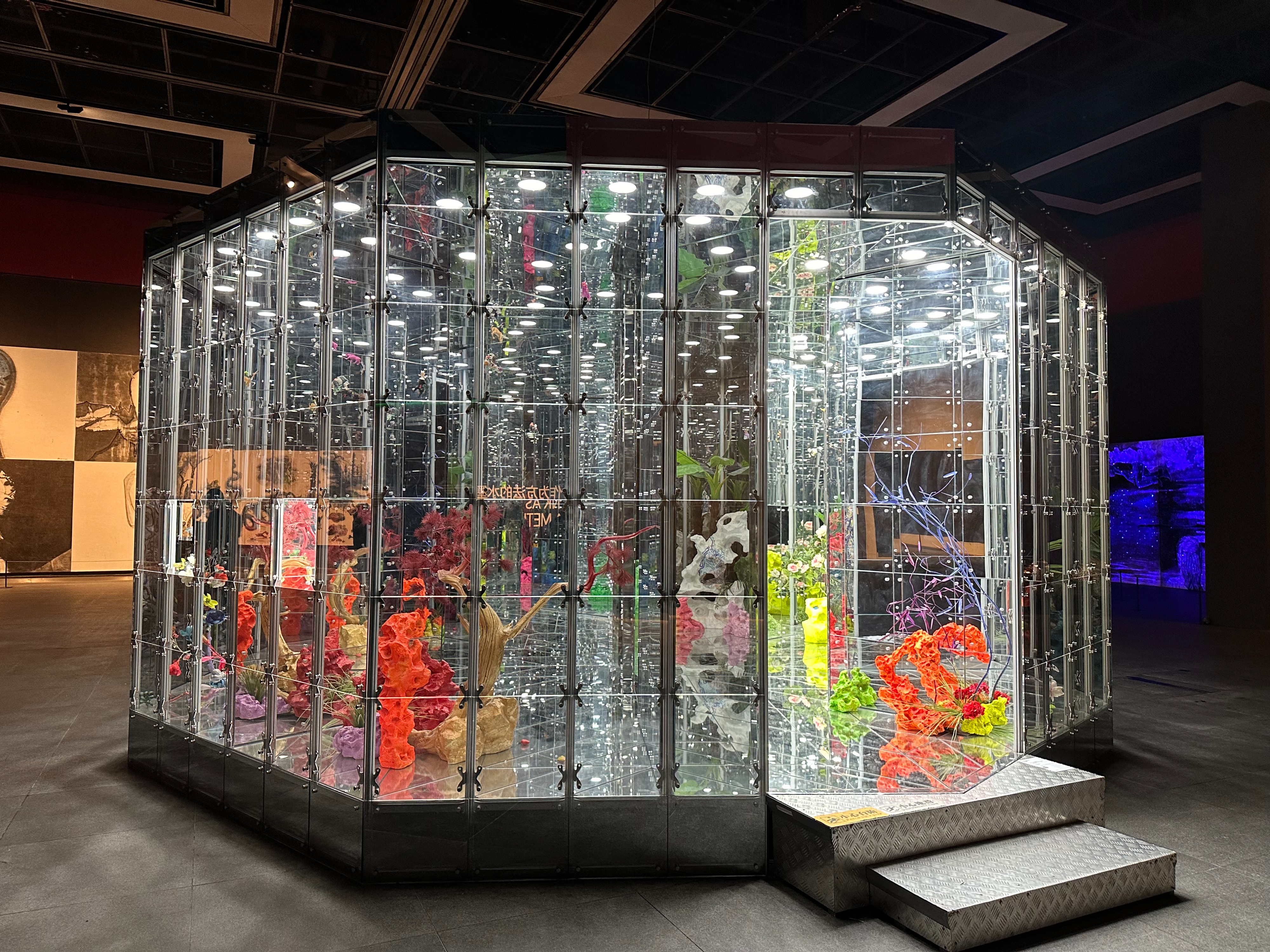 本次双年展的主题是“人智”,不过这可不是“人工智能”的意思,而是强调人的智慧、创造力与独立思想,是对技术主宰的反思,对人性价值的歌颂。进入一楼展厅,最显眼的便是位于正中央由玻璃和镜子组成的小屋。