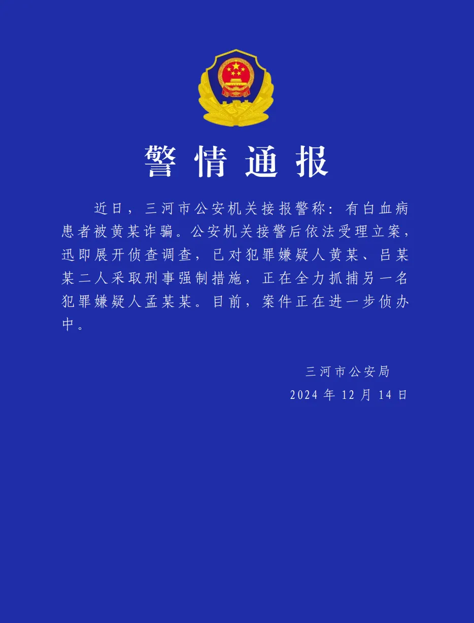 12月14日,河北省三河市公安局发布警情通报称,有白血病患者被诈骗,案件正在进一步侦办中。通报全文如下:(平安三河微信公号)
