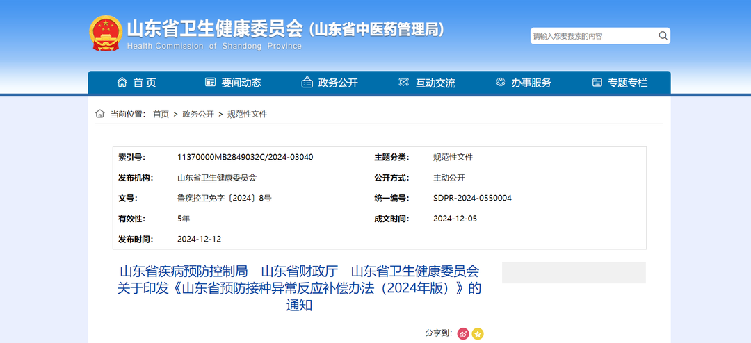 12月12日,山东省卫生健康委员会网站发布山东省疾病预防控制局 山东省财政厅 山东省卫生健康委员会关于印发《山东省预防接种异常反应补偿办法(2024年版)》的通知,2025年1月16日起施行,有效期至2030年1月15日。