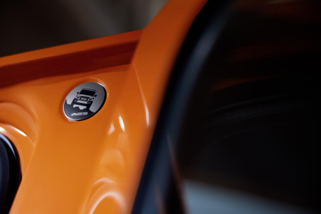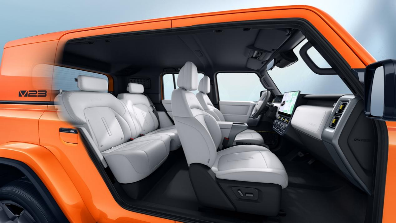 V23不仅在设计上致敬经典,更融合当下新能源设计的趋势,打造出独一无二的视觉体验。V23造型方正硬朗,车身尺寸长4220mm、宽1915mm、高1845mm,接近1:1的高宽比,配合21吋大轮毂,赋予整车超越同级的体量感和视觉冲击力。圆形大灯、固定式侧踏板、C柱盲窗等经典越野元素,与现代科技外露式四角透明毫米波雷达罩、立体悬浮式“小书包”、乐高模块刹车尾灯等设计相结合,使V23既“复古经典”又“科技赛博”。