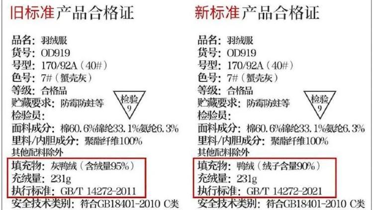 此前,我国羽绒服使用的旧国标《羽绒服装》以“含绒量”作为指标,绒丝、羽丝都可计入含绒量,例如90%含绒量,实际绒子含量只有81%,其余部分可用造价较低的“飞丝”找齐。2022年4月1日,我国实施了新国标《羽绒服装》,其中规定,羽绒服装不再标注含绒量,而应标明羽绒填充物的种类、绒子含量和充绒量,且羽绒服填充物的“绒子含量”不得低于50%。