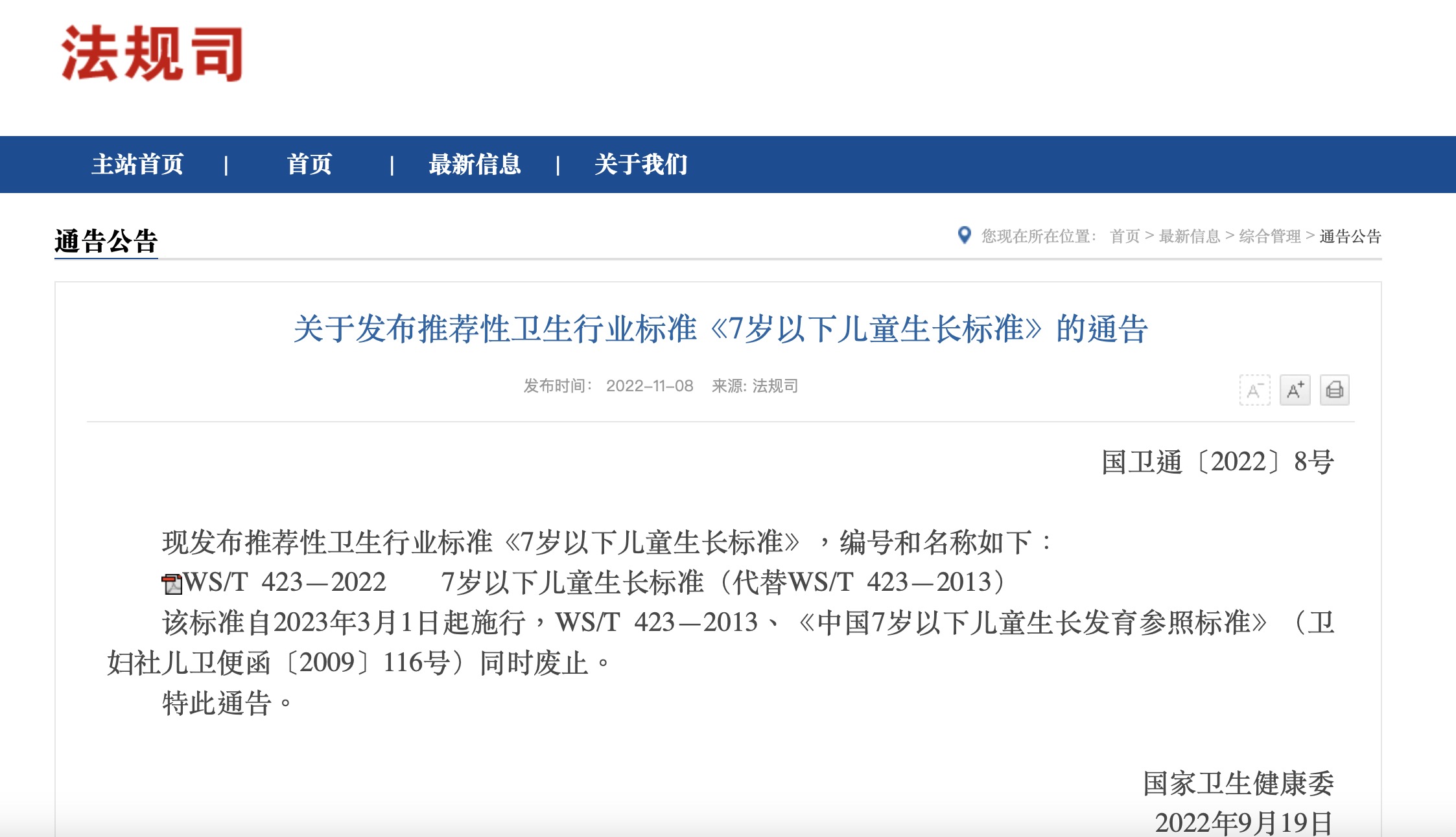 2023年3月1日,新版《7岁以下儿童生长标准》开始实施。该标准包含7岁以下不同年龄男女童在体重、身高、头围、体重、体重指数(BMI)等五个指标上的百分位数和标准差数值,规定了我国儿童生长水平与营养状况的评价指标和评价方法。