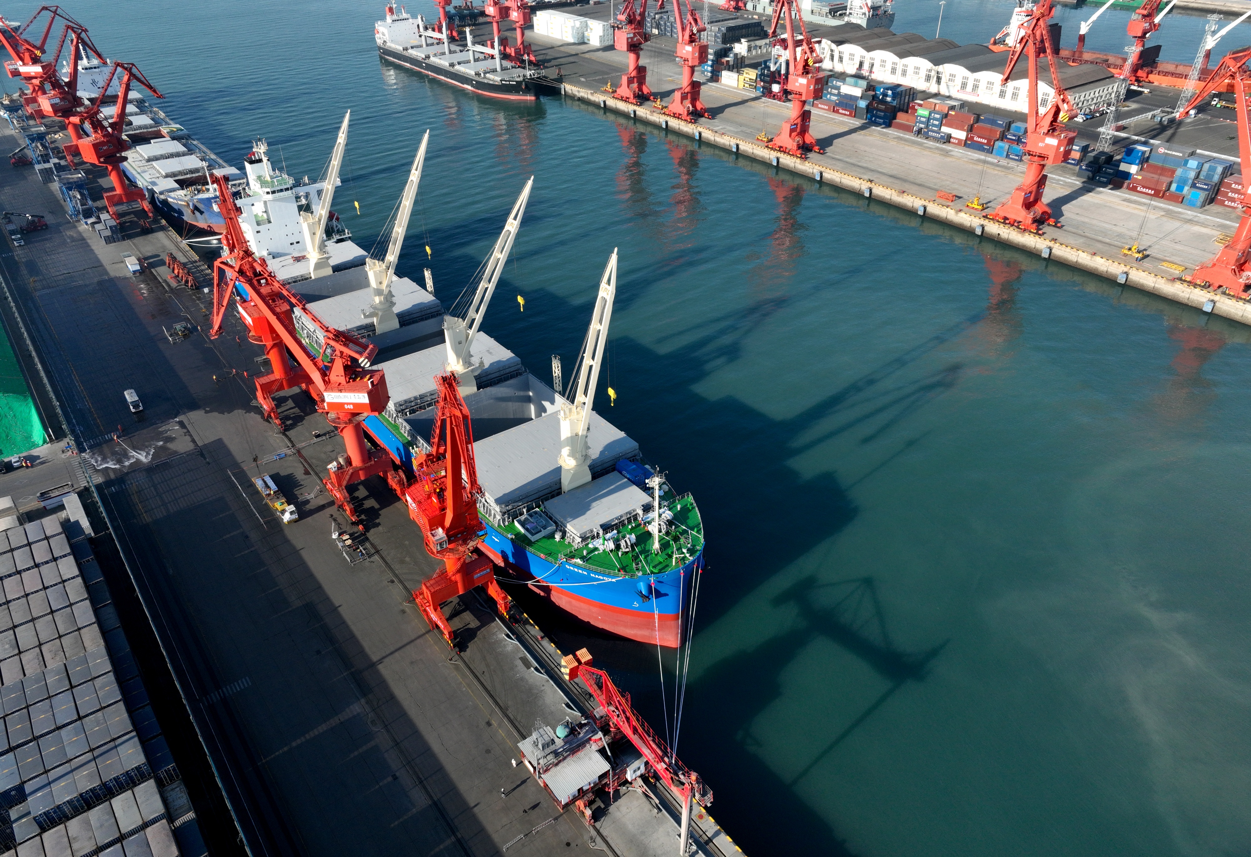 12月16日,搭载车辆、设备、钢材等2万余方货物的“GREEN NAGOYA”轮正在山东港口青岛港码头紧张作业,该轮将在20天后抵达非洲坦桑尼亚达累斯萨拉姆港,标志着山东港口首条东南非直达快航周班正式开通,青岛港成为中远海运特运在中国北方唯一的件杂货班轮“枢纽港”。