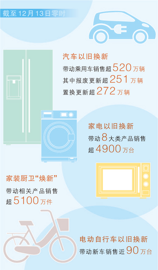 商务部数据显示,开展消费品以旧换新,不仅能让消费者以更低成本购买到更优产品,也能更好发挥扩大有效需求的牵引带动作用。截至12月13日零时,汽车以旧换新带动乘用车销售超520万辆,其中报废更新超251万辆,置换更新超272万辆;家电以旧换新带动8大类产品销售超4900万台;家装厨卫“焕新”带动相关产品销售超5100万件;电动自行车以旧换新带动新车销售近90万台。