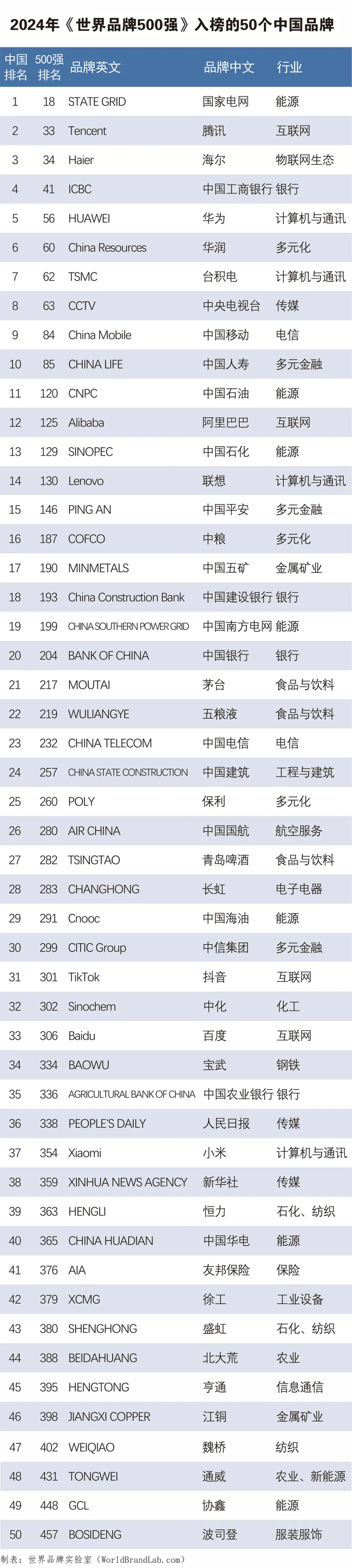 近日,由世界品牌实验室(World Brand Lab)独家编制的2024年度(第二十一届)《世界品牌500强》排行榜揭晓,中国有50个品牌入选,居全球第三。