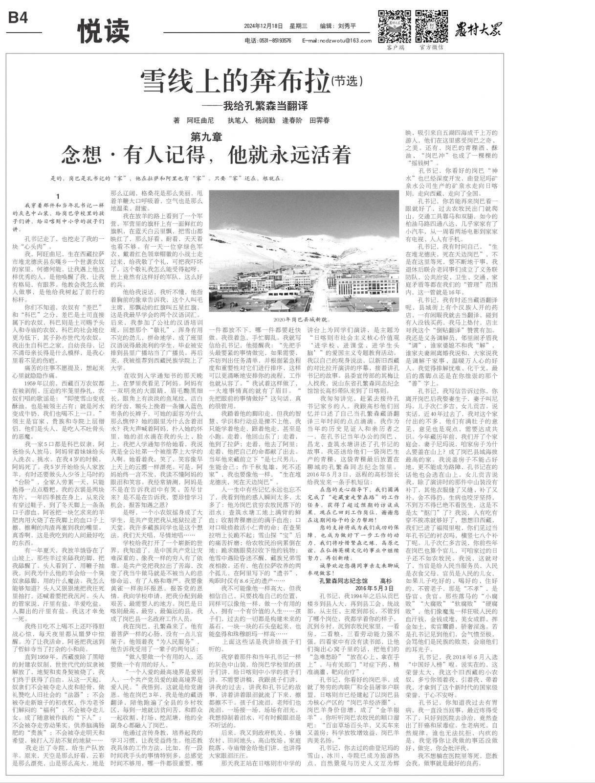 孔书记,我有时还当藏语翻译呢,县城街上有个汉族人开的药店,一有闲暇我就去当翻译,碰到有人没钱买药,我马上垫付,店主对我这个“倒贴翻译”赞赏有加。我还是义务调解员,邻里闹矛盾我“调”,谁家婆媳不和我“解”,谁家夫妻闹离婚我说和,大家说我是调解千家事、温暖万人心的好人。我觉得排解忧难、化干戈,最后的落脚点还是在你推崇的那个“善”字上。