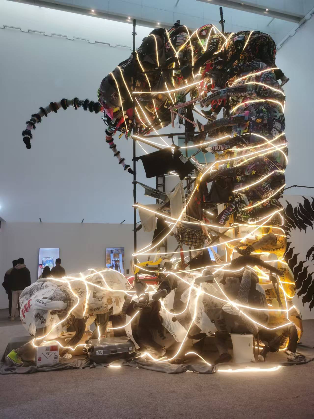 参展艺术家武宁亚带来作品《蜈蚣计划:人、虫、茧》,这是武宁亚自2020年启动的持续性项目《蜈蚣计划》的最新迭代。他用20年内买的1500件衣服300双鞋打造的这部“作品”,看上去是零碎的堆砌,却又是整体的,每一件衣服都在叽叽喳喳说话。展板上写的是,2006年,美国学者凯斯·桑斯坦在其著作《信息乌托邦》中首次提出“信息茧房”这一概念名词,以指代一种互联网环境下矛盾性的“信息自我封闭”现象。作为后互联网时代下个体的武宁亚,无疑也深受“信息茧房”所困,构成“蜈蚣”身体的“消费遗迹”便是直接的物质证明。而另一方面,作为“乌鸦行为”运作者的武宁亚,也无疑成为了一位信息茧房的“编织者”。在展览现场,我碰到了武宁亚先生,我问他,作品要反映什么主题呢?他笑着说:“探讨并呈现个体消费行为与全球化消费社会在后互联网时代的复杂交织。”我似懂非懂,说,是不是用你的行为提醒大家,要时不时地从购买的欲望里跳出来。他说,差不多,如果你看了对你有触动就成。
