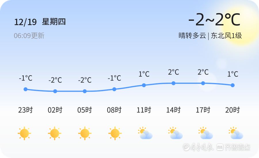 2024年12月19日,农历十一月十九,清晨0609,菏泽市天气状况为晴转多云,气温较低,最高气温2℃,最低气温-2℃,伴有东北风1级,空气湿度48%,PM2.5浓度为41微克/立方米。市区及各区县天气情况大致相同,均以晴转多云为主,气温偏低,市民出行需注意防寒保暖。