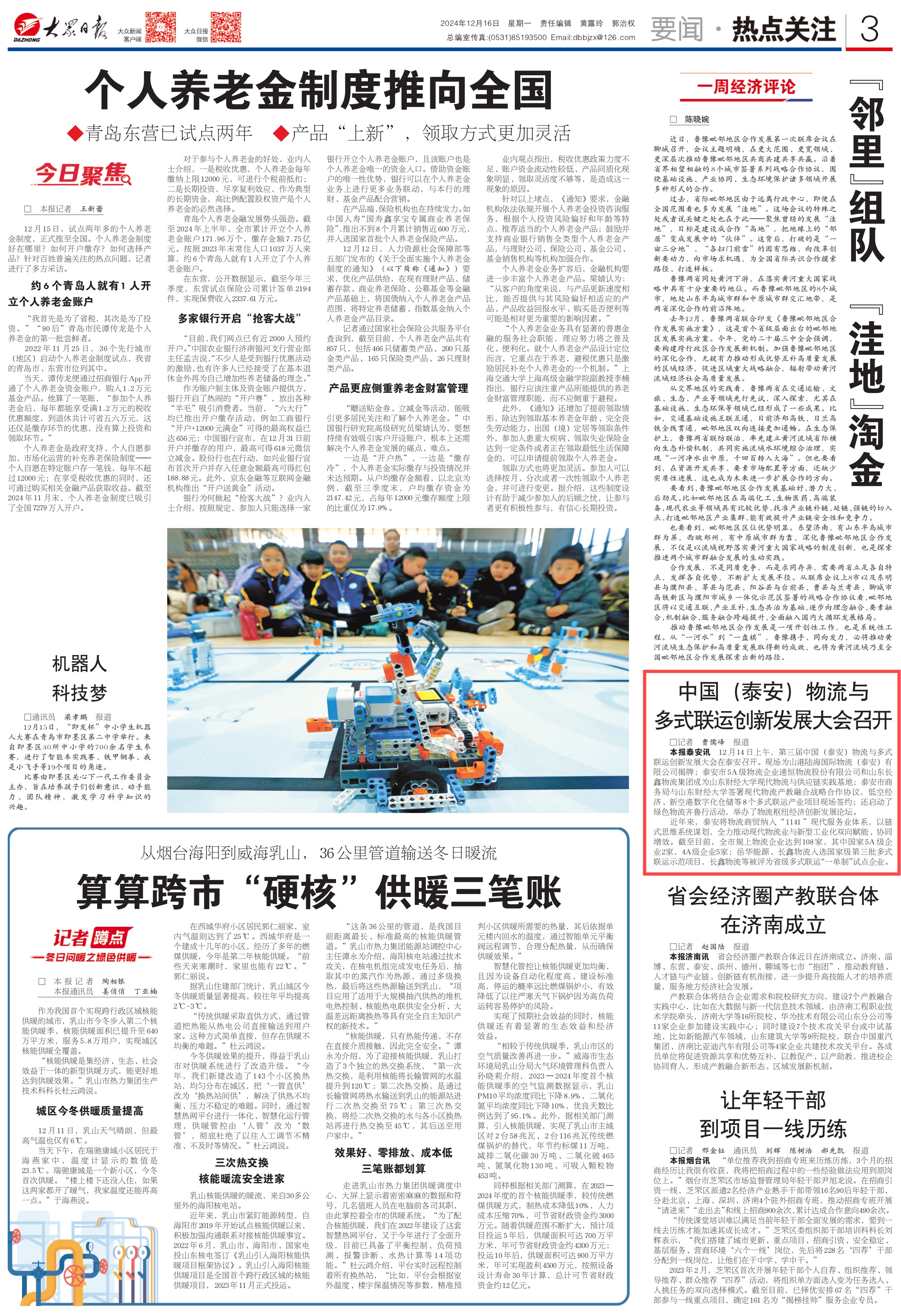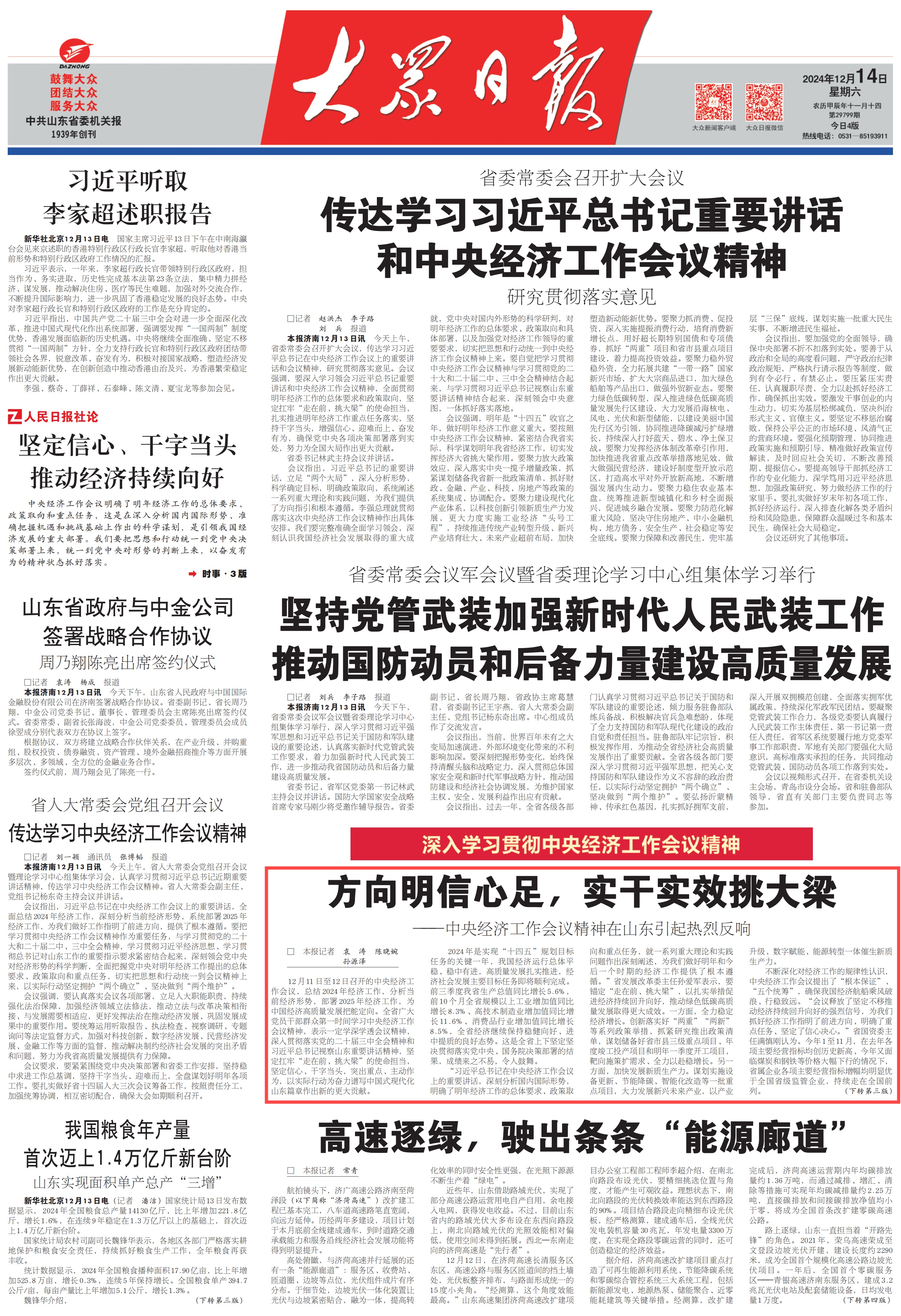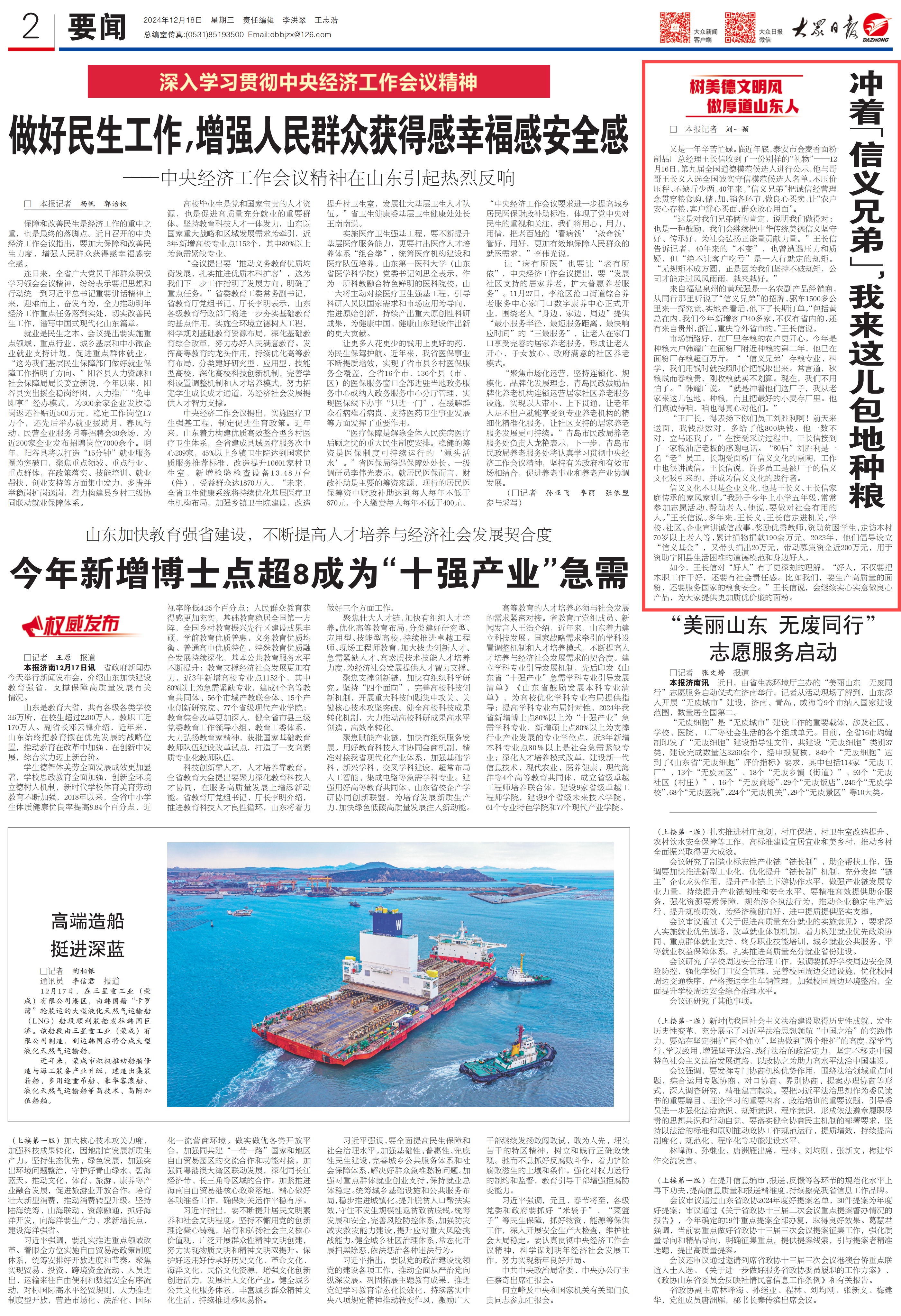 12月14日,头版刊发《方向明信心足,实干实效挑大梁》,报道中央经济工作会议反响:泰山区积极布局建设高能级科技创新平台,做大做强4大优势产业,前瞻布局4大未来产业,产业发展不断提速、创新能力不断提升。泰山区委书记张培峰表示,将更好把握新一轮科技革命和产业变革机遇,培育壮大新质生产力,大力推动产业基础、产业韧性、产业动能全面提升。详情点击这里——《方向明信心足,实干实效挑大梁》