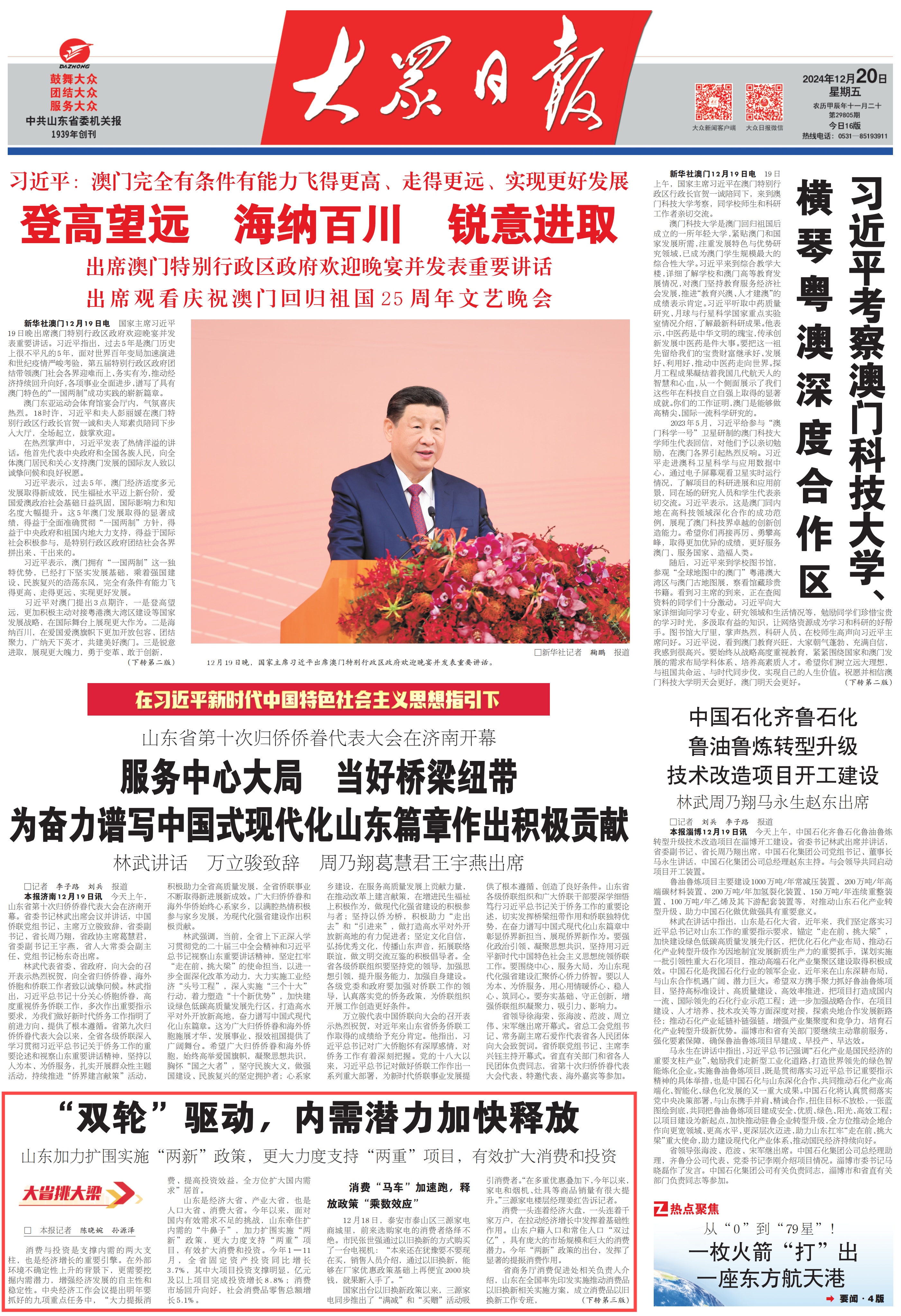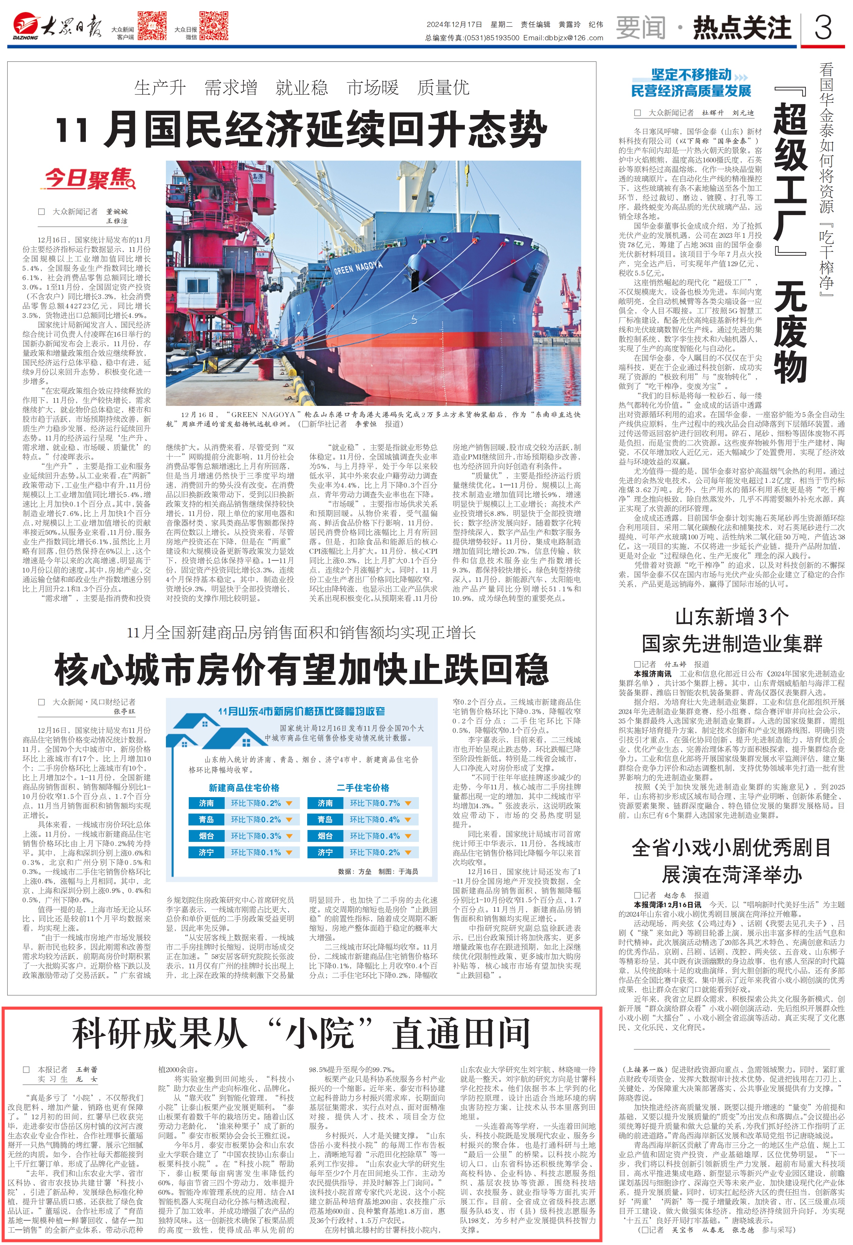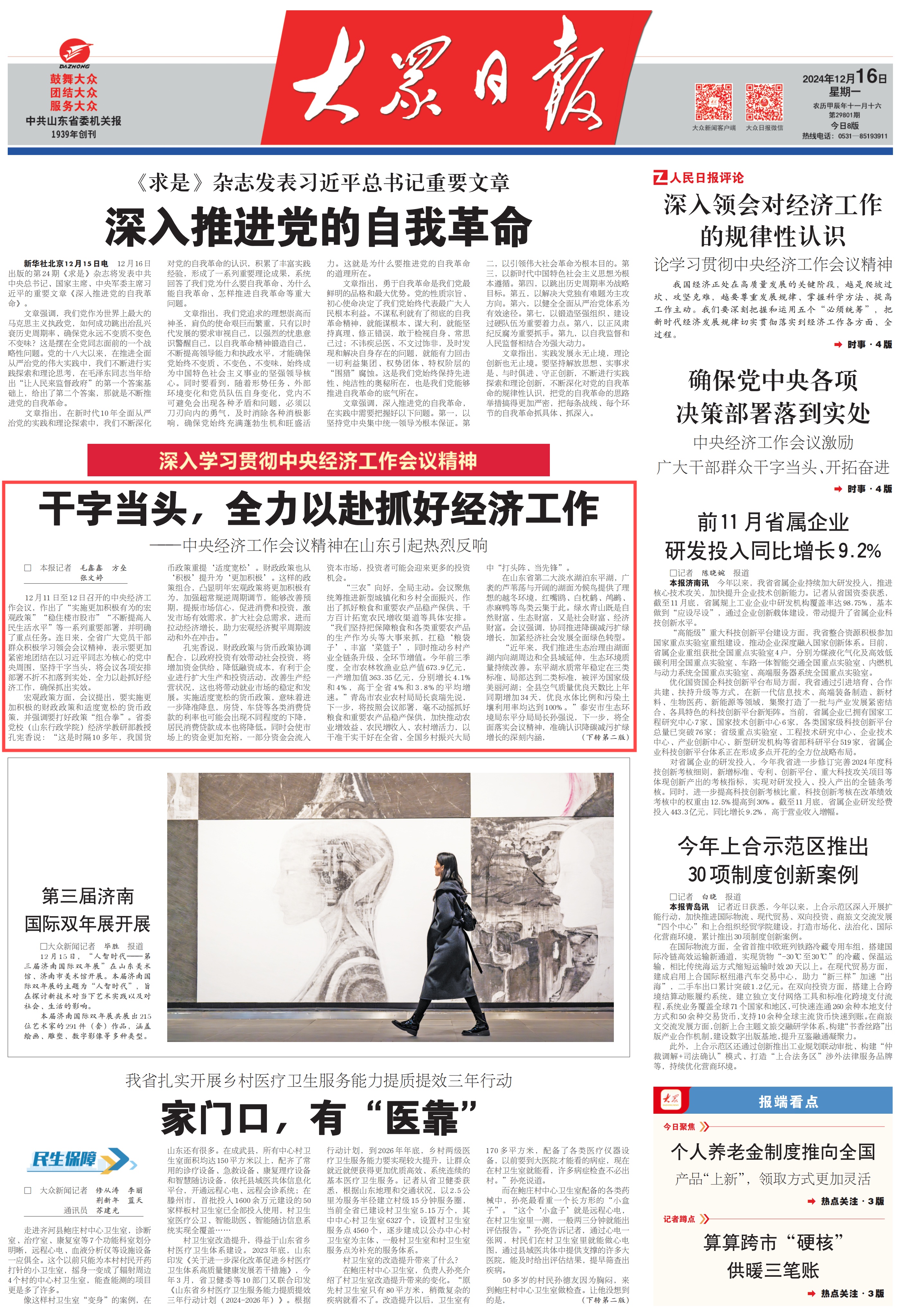 12月14日,头版刊发《方向明信心足,实干实效挑大梁》,报道中央经济工作会议反响:泰山区积极布局建设高能级科技创新平台,做大做强4大优势产业,前瞻布局4大未来产业,产业发展不断提速、创新能力不断提升。泰山区委书记张培峰表示,将更好把握新一轮科技革命和产业变革机遇,培育壮大新质生产力,大力推动产业基础、产业韧性、产业动能全面提升。详情点击这里——《方向明信心足,实干实效挑大梁》