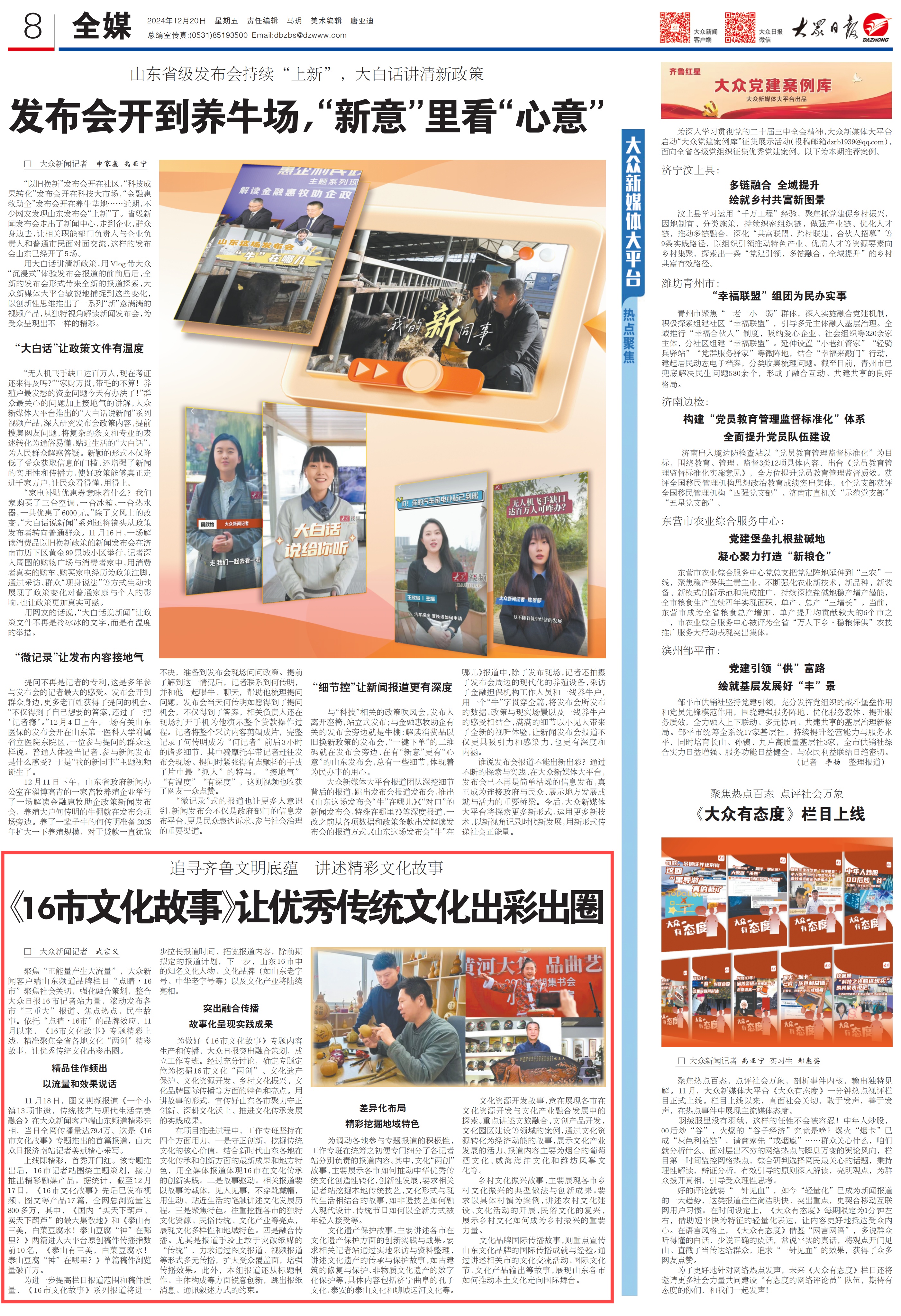 12月20日,8版刊发《<16市文化故事>让优秀传统文化出彩出圈》,报道由大众日报泰安记者站采制的作品《泰山有三美,白菜豆腐水!泰山豆腐“神”在哪里?》单篇稿件浏览量破百万,冲上大众大平台原创稿件传播指数TOP10。详情点击这里——《<16市文化故事>让优秀传统文化出彩出圈》