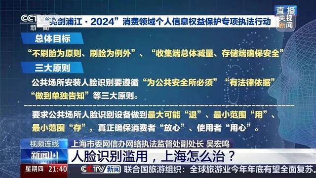 上海市委网信办网络执法监督处副处长吴宏鸣介绍,通过调研了解,在上海一些消费领域,人脸识别技术存在滥用的现象,所谓滥用就是随意地或者是不合规地使用人脸识别技术,收集消费者的人脸敏感信息,根据《个人信息保护法》相关的规定要求,人脸生物信息属于敏感个人信息,要受特殊的保护,针对这种现象,我们展开了相应综合整治的行动。