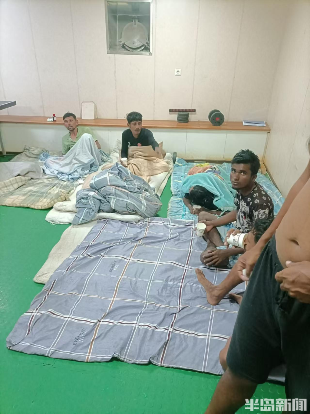 “15名落水者一来到船上,就感受到了我们中国船员送来的温暖。”孙义磊介绍,获救者登船的那一刻,船员们及时送来了提前备好的食物、淡水等物资,大家迅速腾出船员房间安置他们,还拿来自己的衣服让他们换上。记者通过现场图片看到,获救人员在房间内打起了地铺,有的人将被子紧紧地裹在身上取暖。