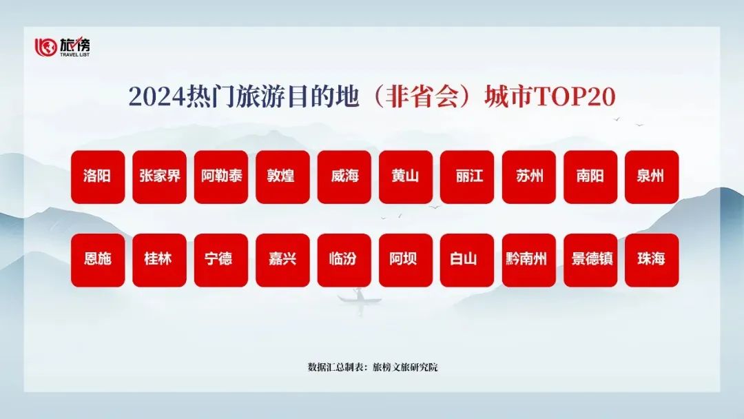 大会现场,发布了由旅榜文旅研究院联合各地文旅部门、旅游协会、文旅企业评选的《2024热门旅游目的地(非省会)城市TOP20》榜单。洛阳、张家界、阿勒泰、敦煌、威海、黄山、丽江、苏州、南阳、泉州、恩施、桂林、宁德、嘉兴、临汾、阿坝、白山、黔南州、景德镇和珠海20城上榜。该榜单评价标准包括目的地热度、行业影响力、从业者喜爱度、旅游企业认可度等。