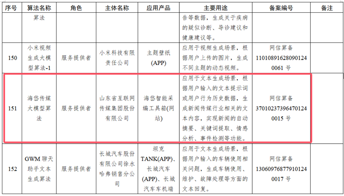 12月20日,国家互联网信息办公室发布第九批境内深度合成服务算法备案信息,由山东省互联网传媒集团旗下山东大众信息产业有限公司重点研发的海岱传媒大模型算法位列其中。该大模型算法将广泛应用于文本生成场景,根据用户输入的文本提示词或用户行为历史数据,生成新闻传媒行业相关的文本内容,实现新闻的自动摘要、关键词提取、情感分析、事件检测等功能。