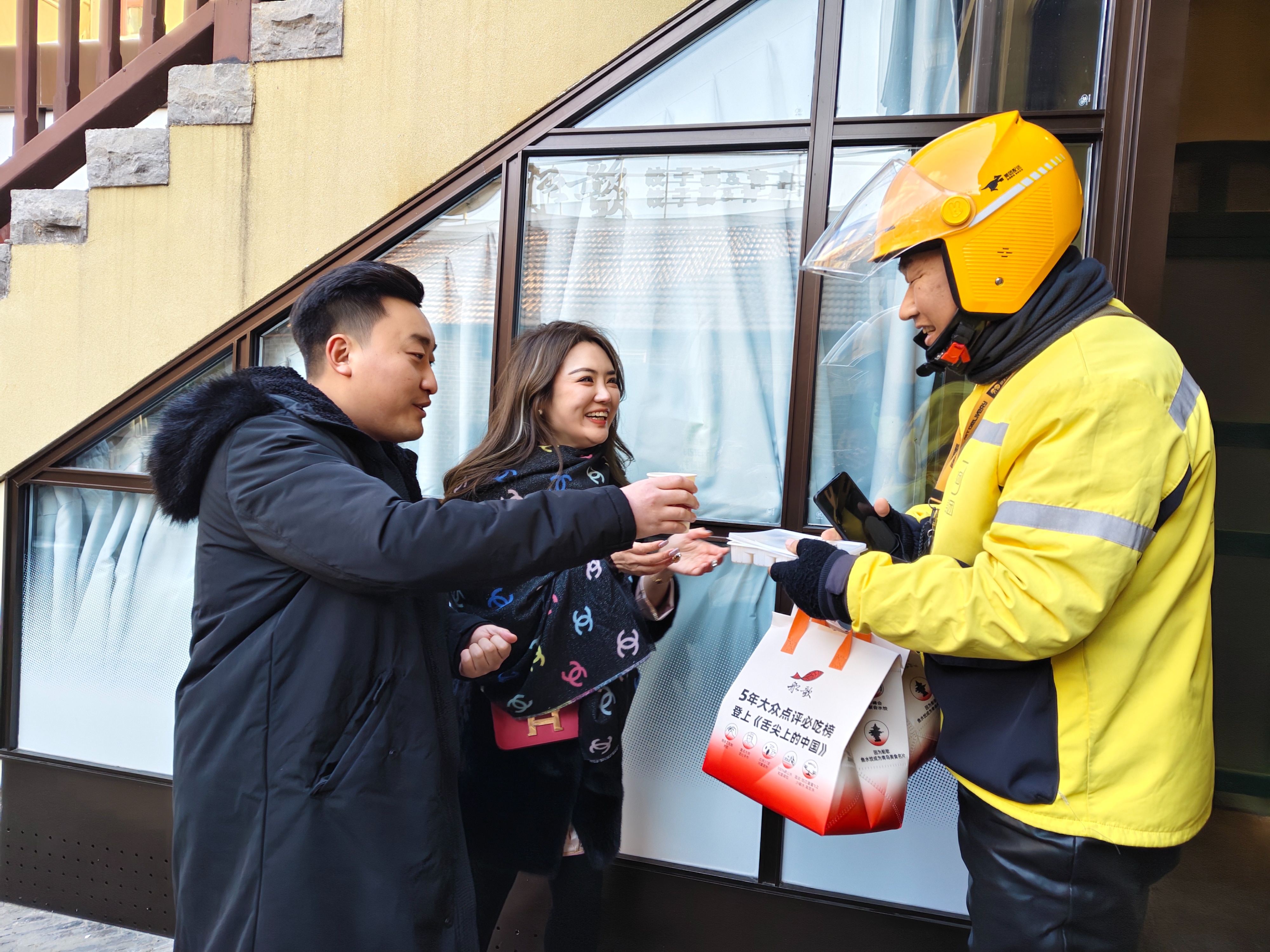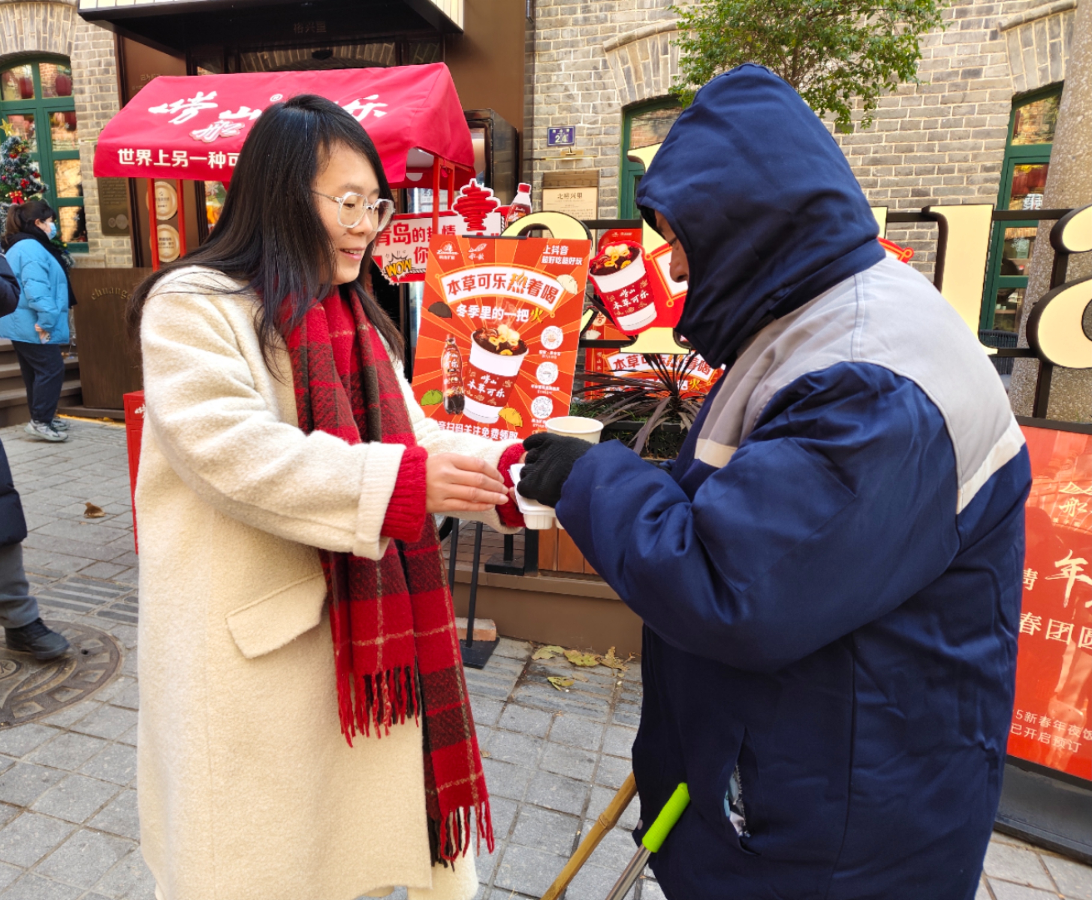 “瓶”水相逢情暖冬至,青岛“网红天团”为户外工作者送崂山热可乐和水饺