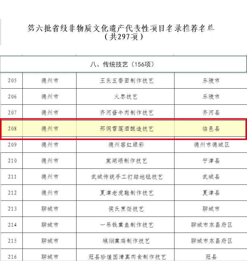 2024年12月19日,洛北春·邢侗雪莲酒传统酿造技艺被山东省人民政府批准列为第六批省级非物质文化遗产代表性项目名录。