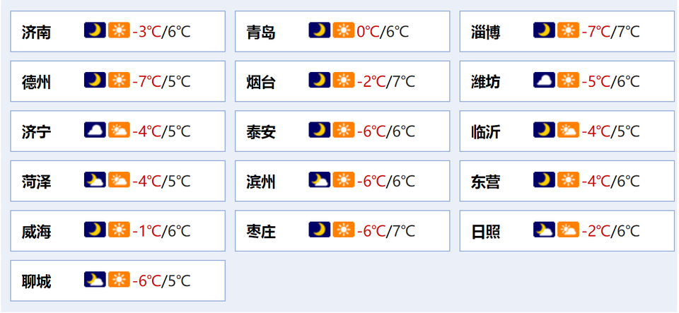 最低气温:鲁西北、鲁中山区和半岛内陆地区-5°C左右,沿海地区-1°C左右,其他地区-3°C左右。