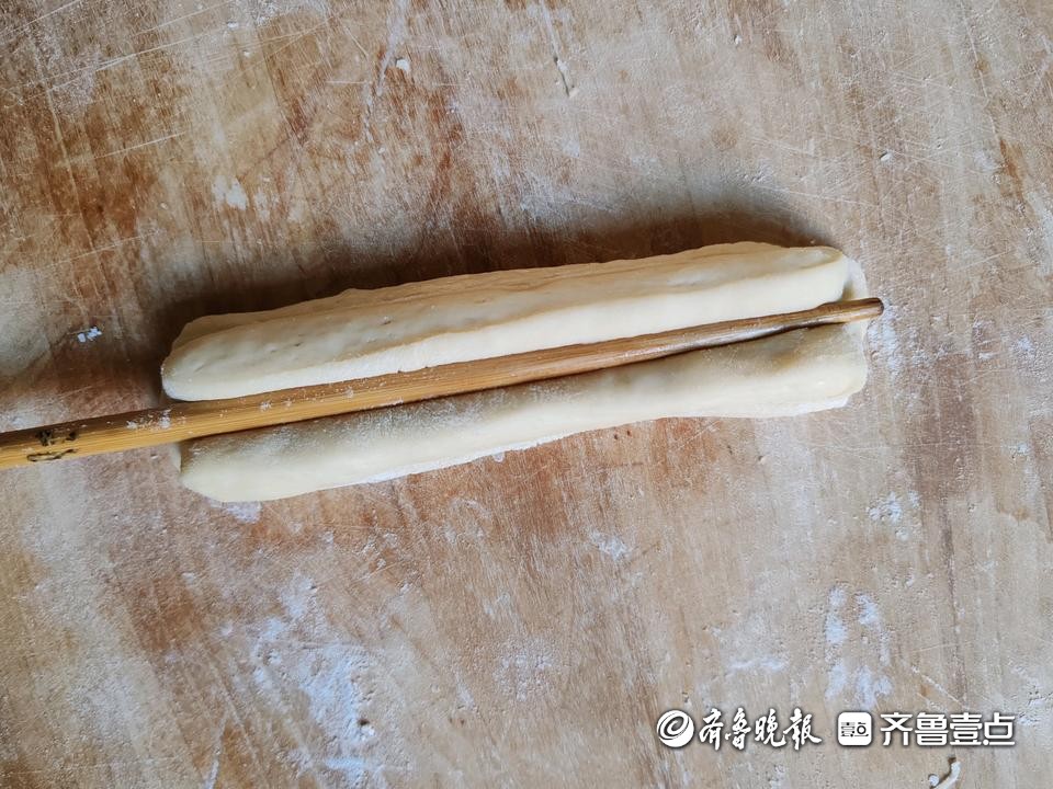 3.取两个长条叠在一起,筷子可以沾点油,用筷子按压一下,用手把两头一捏,油条就做好了。