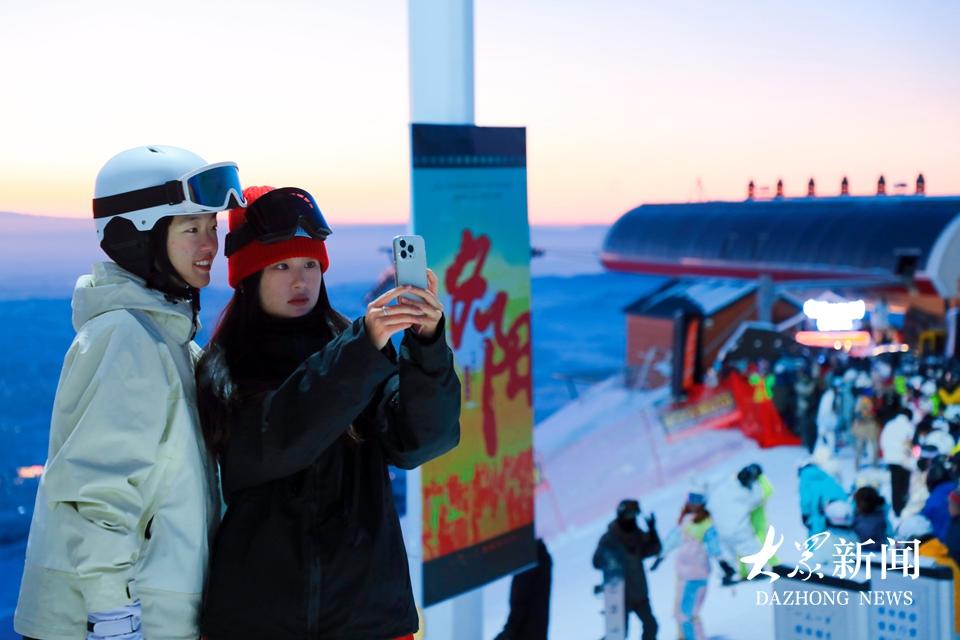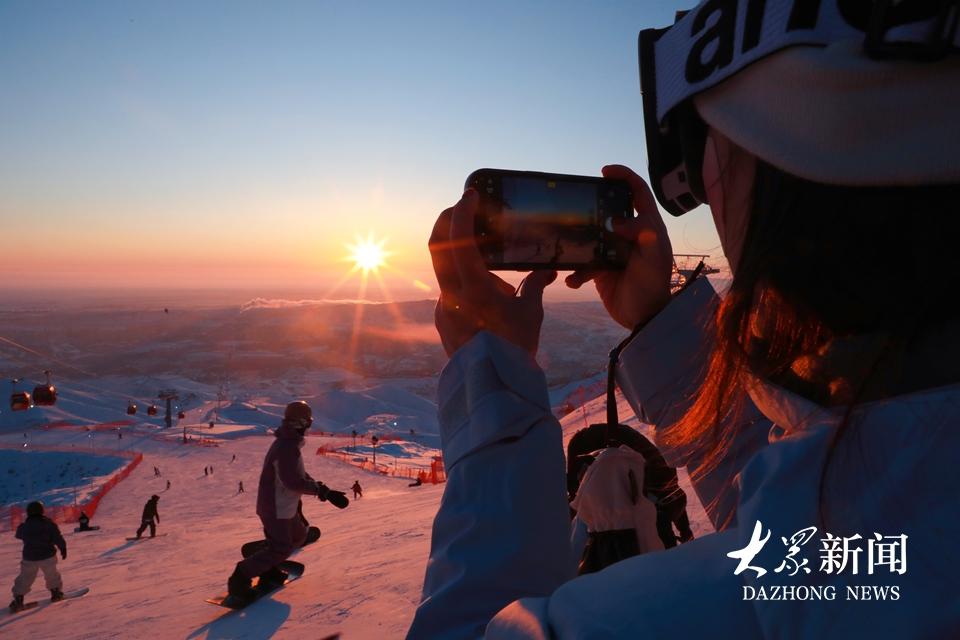 12月24日傍晚,滑雪爱好者在新疆阿勒泰市将军山国际滑雪度假区山顶上的“夕阳派对”拍照打卡。