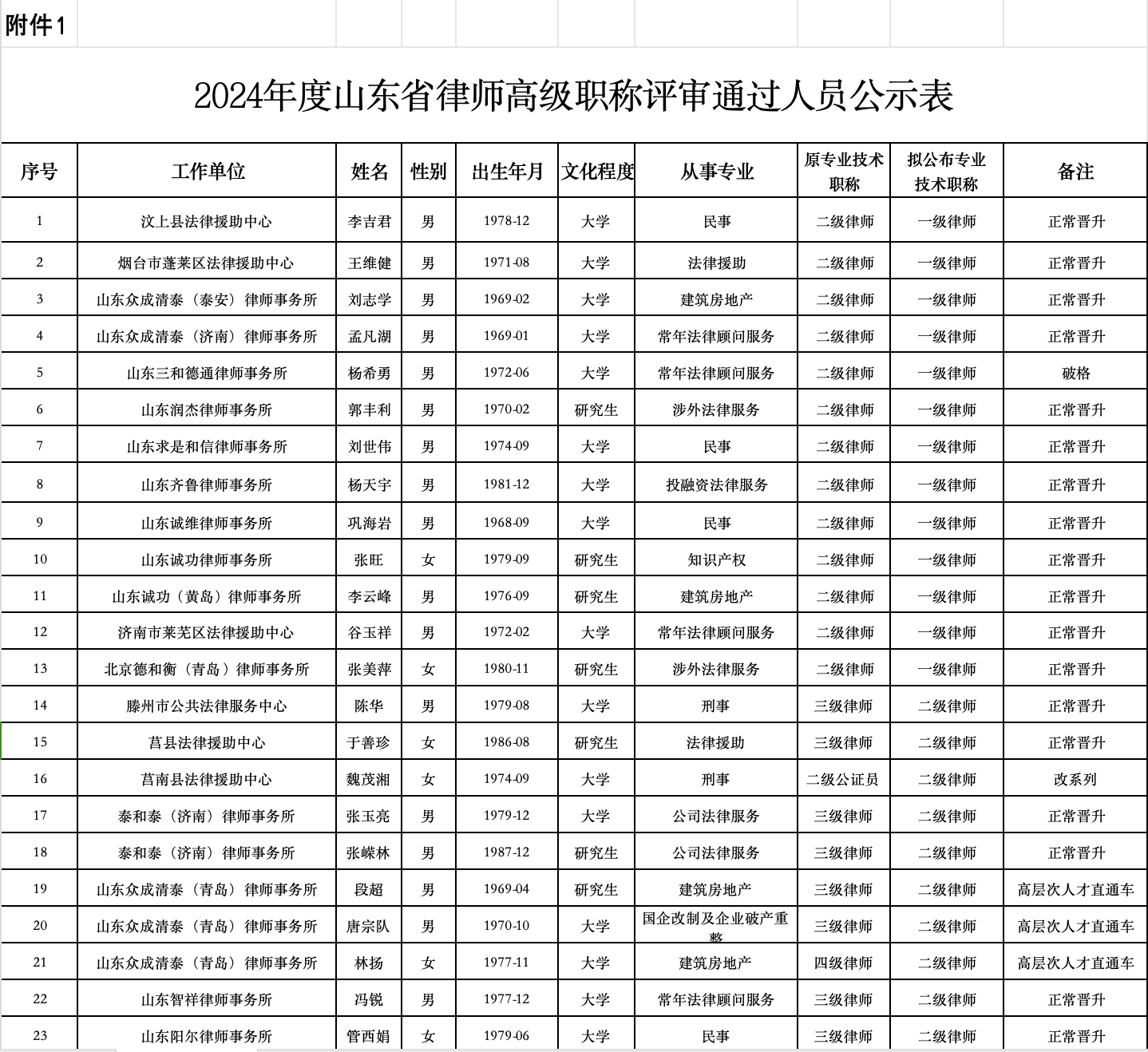 附:2024年度山东省律师高级职称评审通过人员公示表
