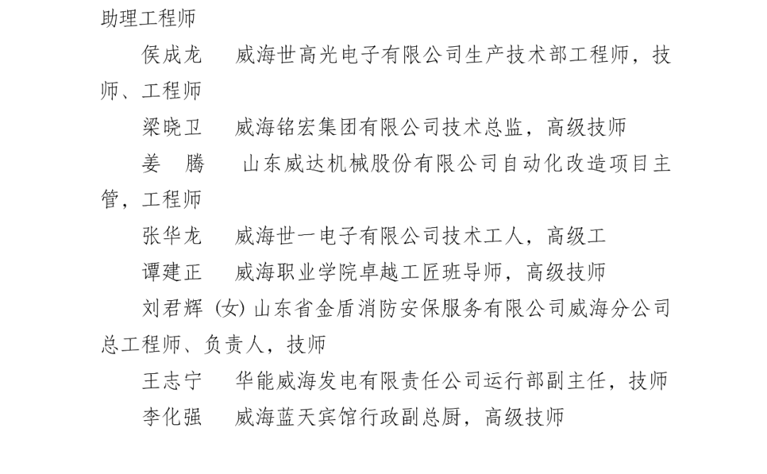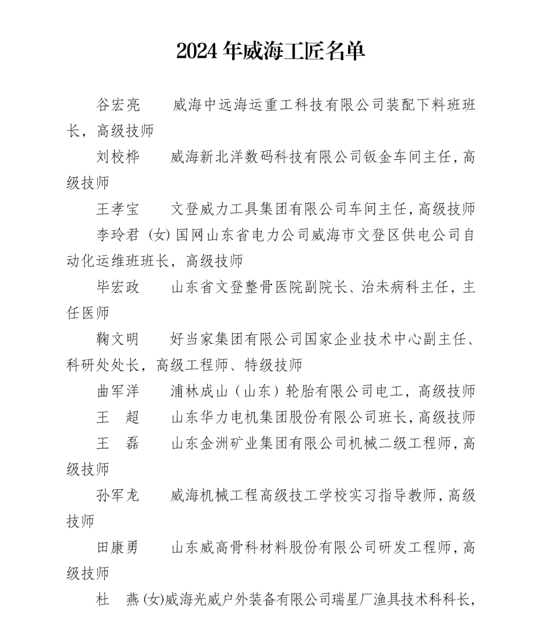 2024年,威海市总工会组织开展了威海工匠培育工作。经集中推荐培育,确定谷宏亮等20名同志为威海工匠,现予公布。