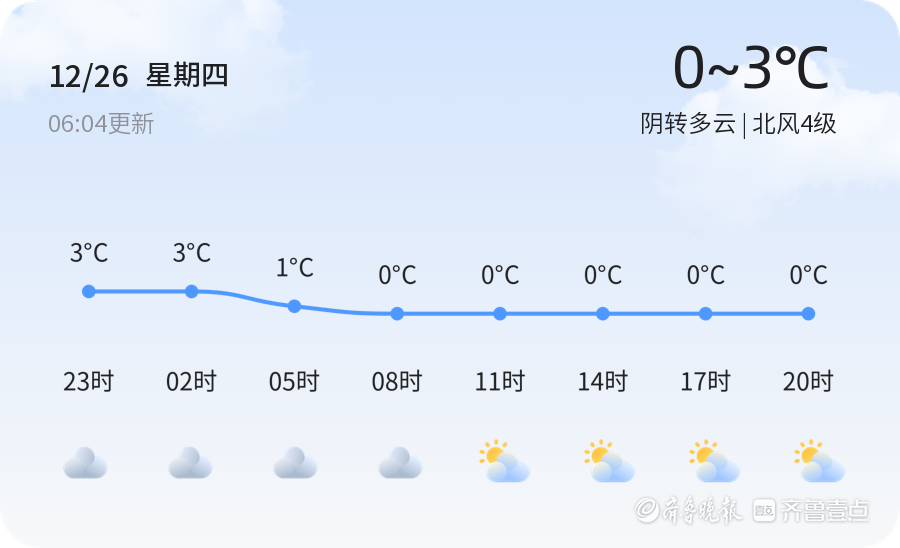 2024年12月26日,农历十一月廿六,威海今日天气以阴转多云为主,最低气温0℃,最高气温3℃,北风4级,空气湿度59%,PM2.5浓度为54微克/立方米。市区及下辖各区均呈现出相似的天气状况,市民出行需注意防寒保暖。