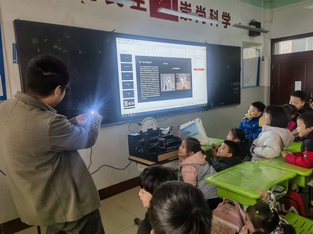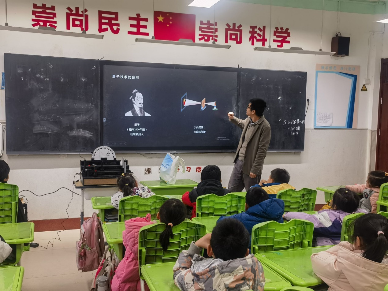 随后,申屠语辰爸爸深入浅出的介绍了中外伟大的科学家爱因斯坦和墨子,介绍了量子、原子、光子等物理学基本概念和量子纠缠、量子通信和量子计算机的应用,通过生动的描述和有趣的比喻,激发同学们对科学的兴趣。