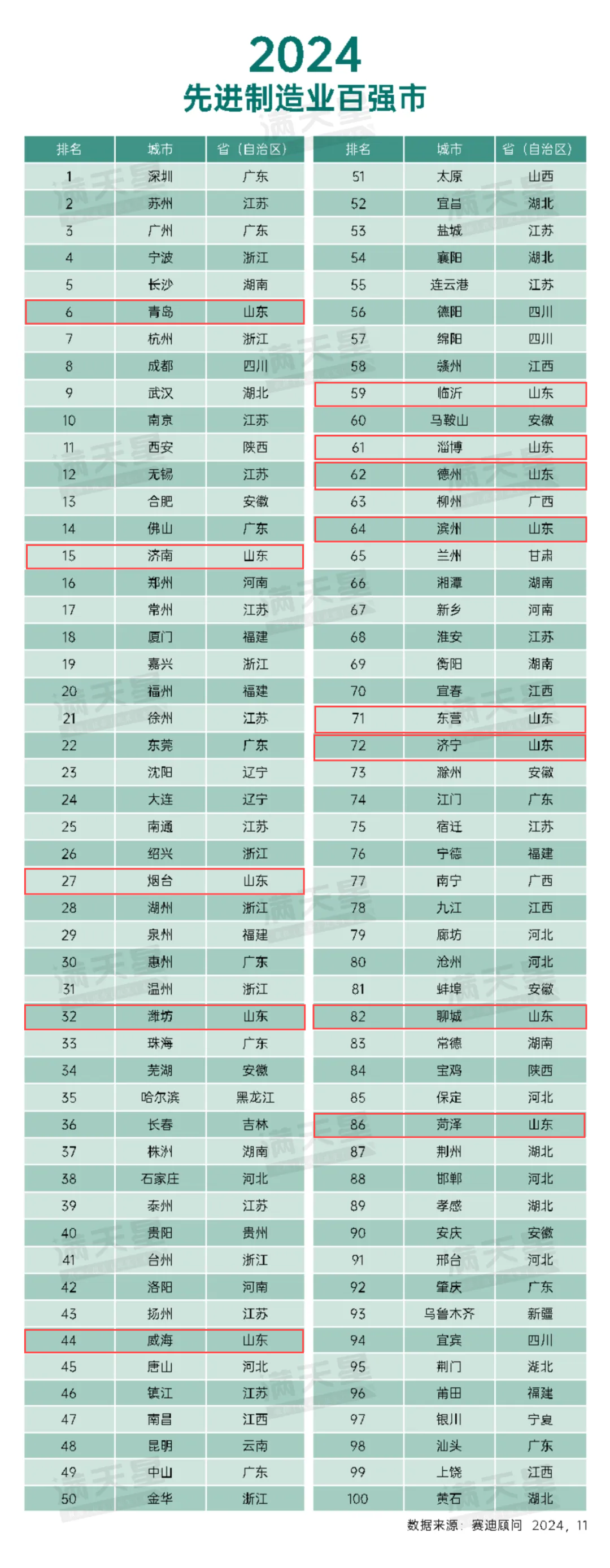城市是中国推进新型工业化、打造以先进制造业为骨干的现代化产业体系的重要载体。赛迪顾问于12月25日举办的2024先进制造业发展大会上发布《2024年先进制造业城市研究》,提出城市先进制造业发展的三类模式、三大趋势、三点建议,发布2024先进制造业百强市,其中山东省有13市上榜。榜单如下: