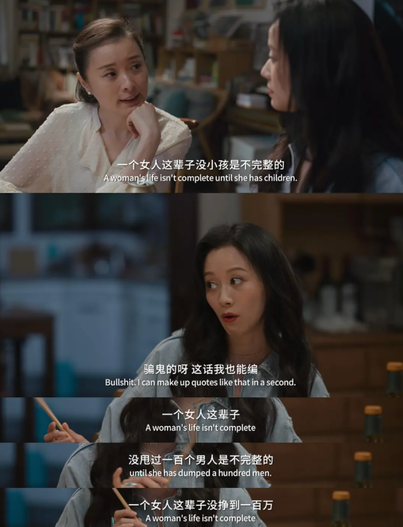 “饭桌”是邵艺辉电影里发生观点交锋的重要场所,承担着话题沙龙的作用。在《爱情神话》里,三女两男围绕着“如何成为一个完整女人”展开讨论:“不生孩子的女人不完整”“没为自己活过的女人不完整”“不挣100万的女人不完整”……末了老白补了一句,“没有造反过的女人不完整”。