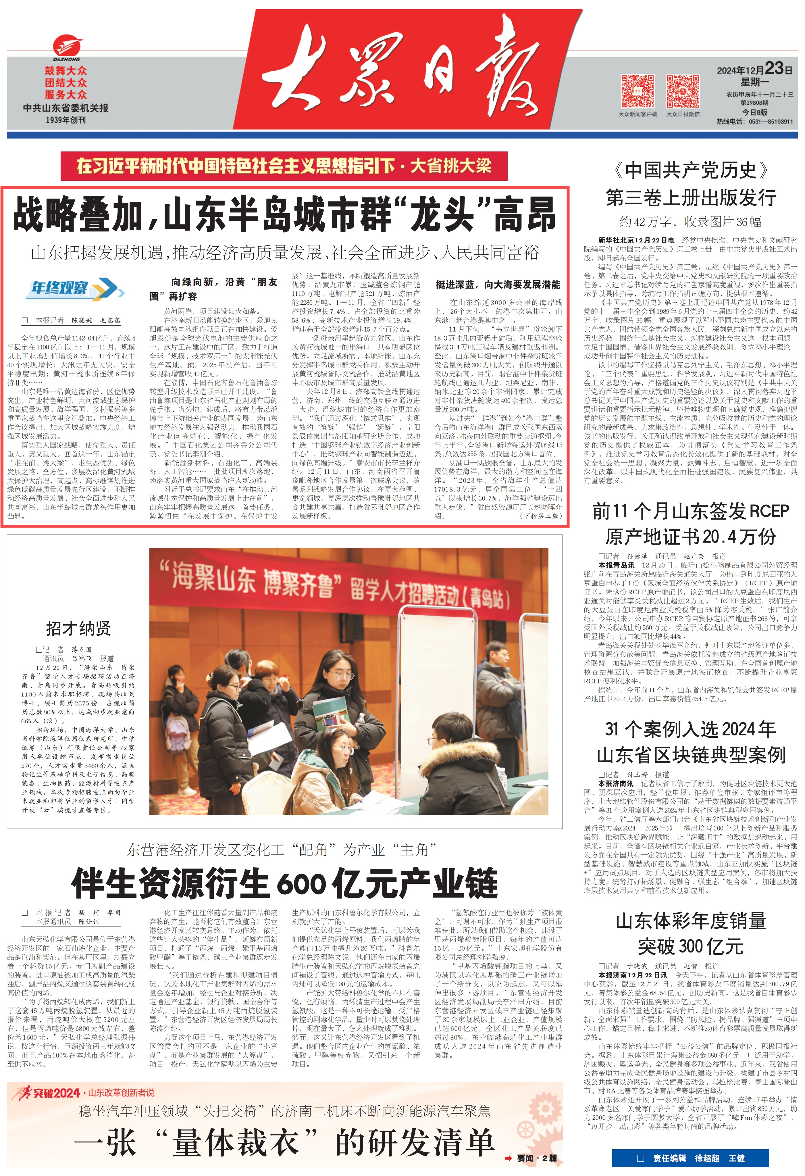 12月23日,头版刊发《战略叠加,山东半岛城市群“龙头”高昂》,报道宁阳县辰信集团与洛阳轴承研究所合作,成功打造中国钢球产业链数字经济产业创新中心。泰安市市长李兰祥介绍,山东、河南两省召开鲁豫毗邻地区合作发展第一次联席会议,打造省际毗邻地区合作发展新样板。详情点击这里——《战略叠加,山东半岛城市群“龙头”高昂》