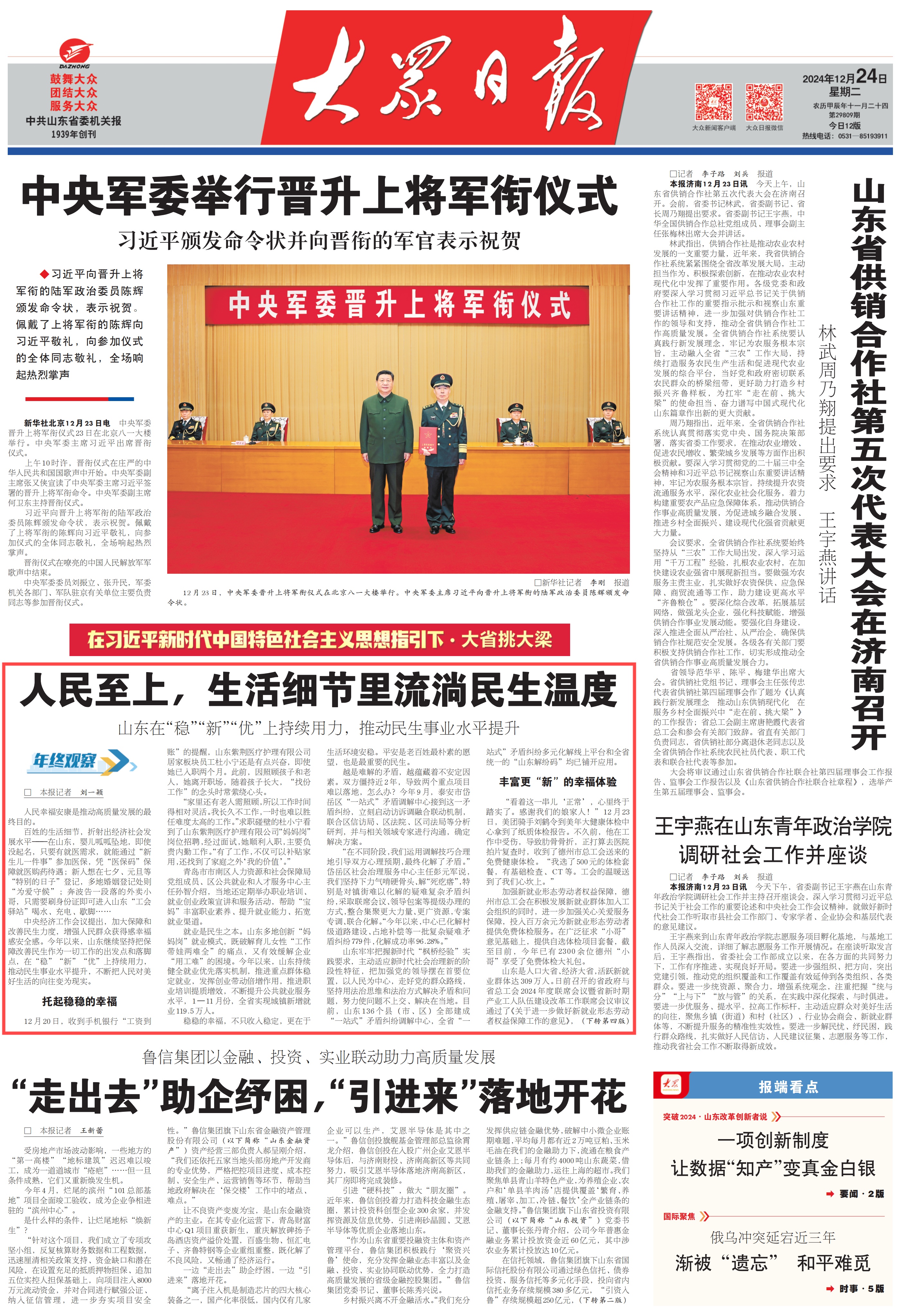 12月24日,头版刊发《人民至上,生活细节里流淌民生温度》,报道岱岳区一站式矛调中心对镇街难以化解的疑难复杂矛盾纠纷,采取联席会议、领导包案等提级办理的方式,整合集聚更大力量、更广资源,专案专调、联合化解。详情点击这里——《人民至上,生活细节里流淌民生温度》
