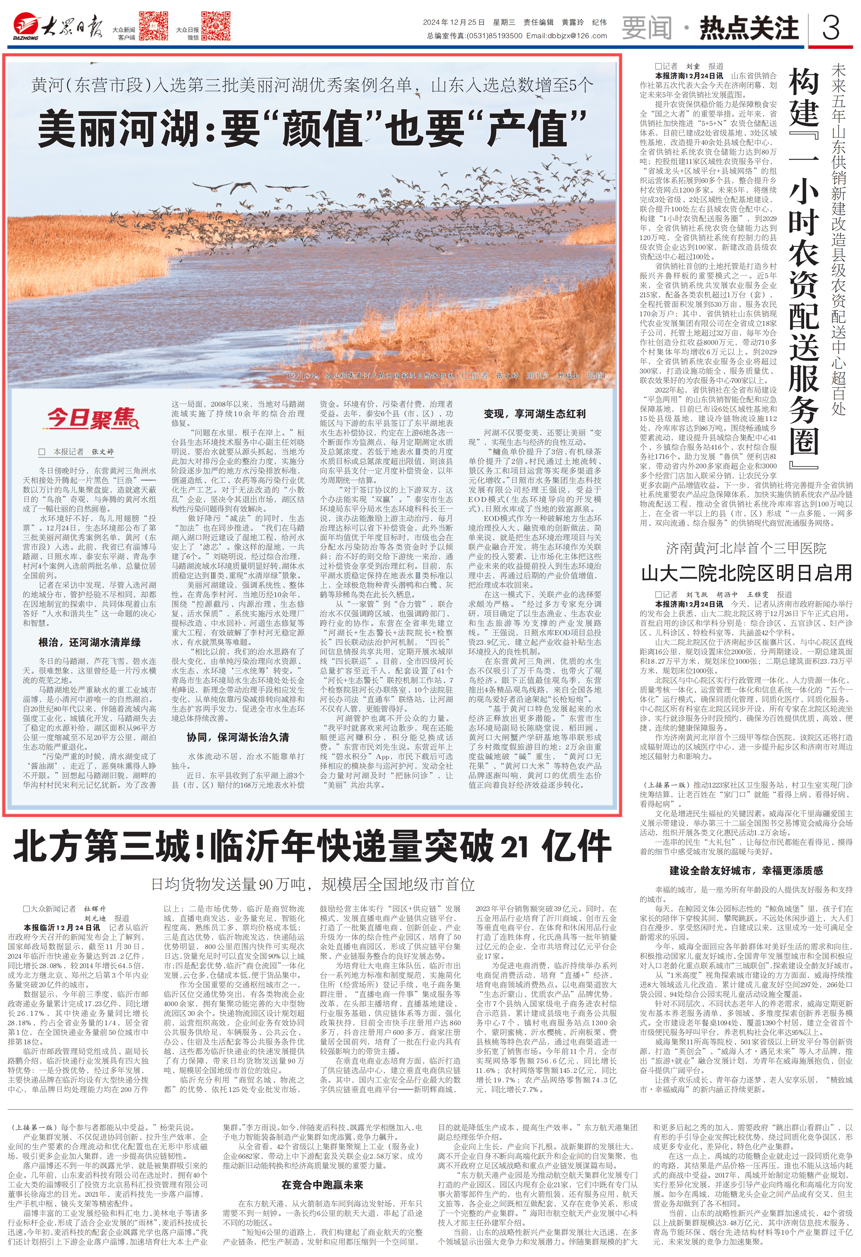 12月25日,3版要闻刊发《美丽河湖:要“颜值”也要“产值”》,报道泰安6个县(市、区)、功能区与下游的东平县签订了东平湖地表水生态补偿协议,实现双赢。目前,东平湖水质稳定保持在地表水Ⅲ类标准以上,全球极危物种青头潜鸭和白鹭、灰鹤等珍稀鸟类在此长久栖息。详情点击这里——《美丽河湖:要“颜值”也要“产值”》