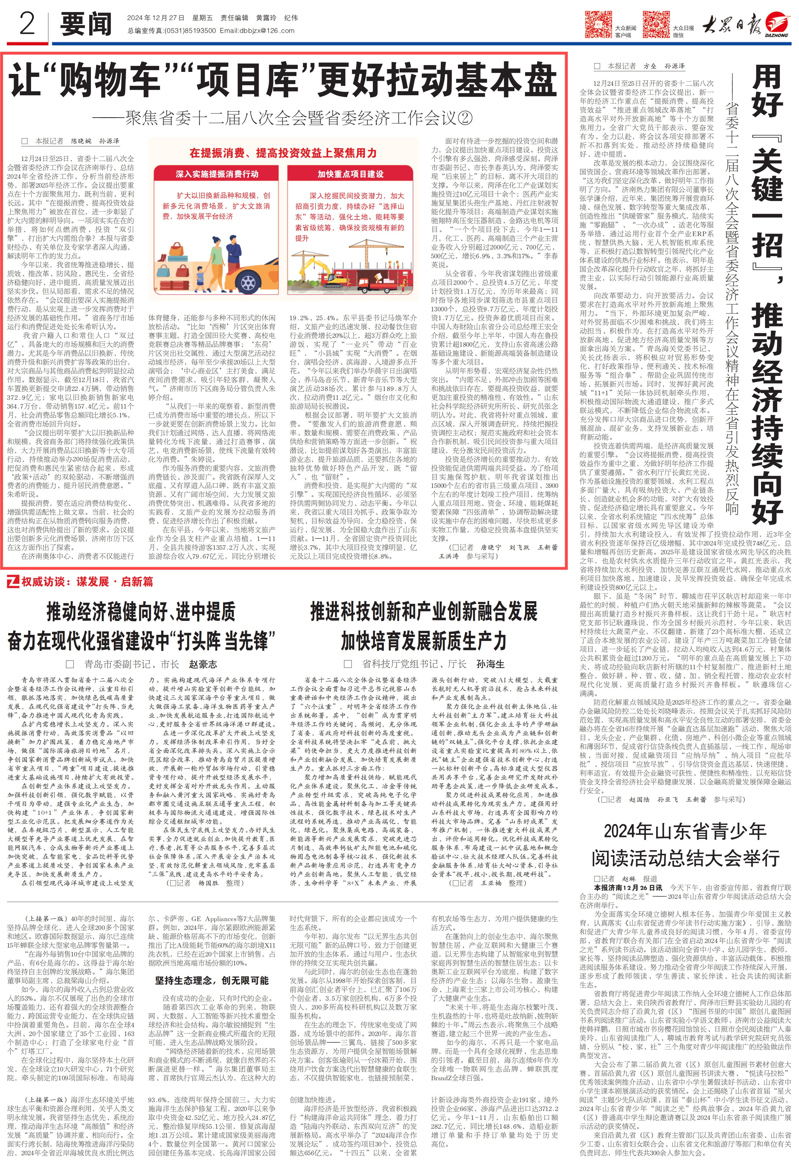 12月27日,2版要闻刊发《让“购物车”“项目库”更好拉动基本盘》,报道今年以来,东平将文旅产业作为全县支柱产业重点培植,1—11月,全县共接待游客1357.2万人次、实现旅游综合收入79.67亿元,同比分别增长19.2%、25.4%。详情点击这里——《让“购物车”“项目库”更好拉动基本盘》