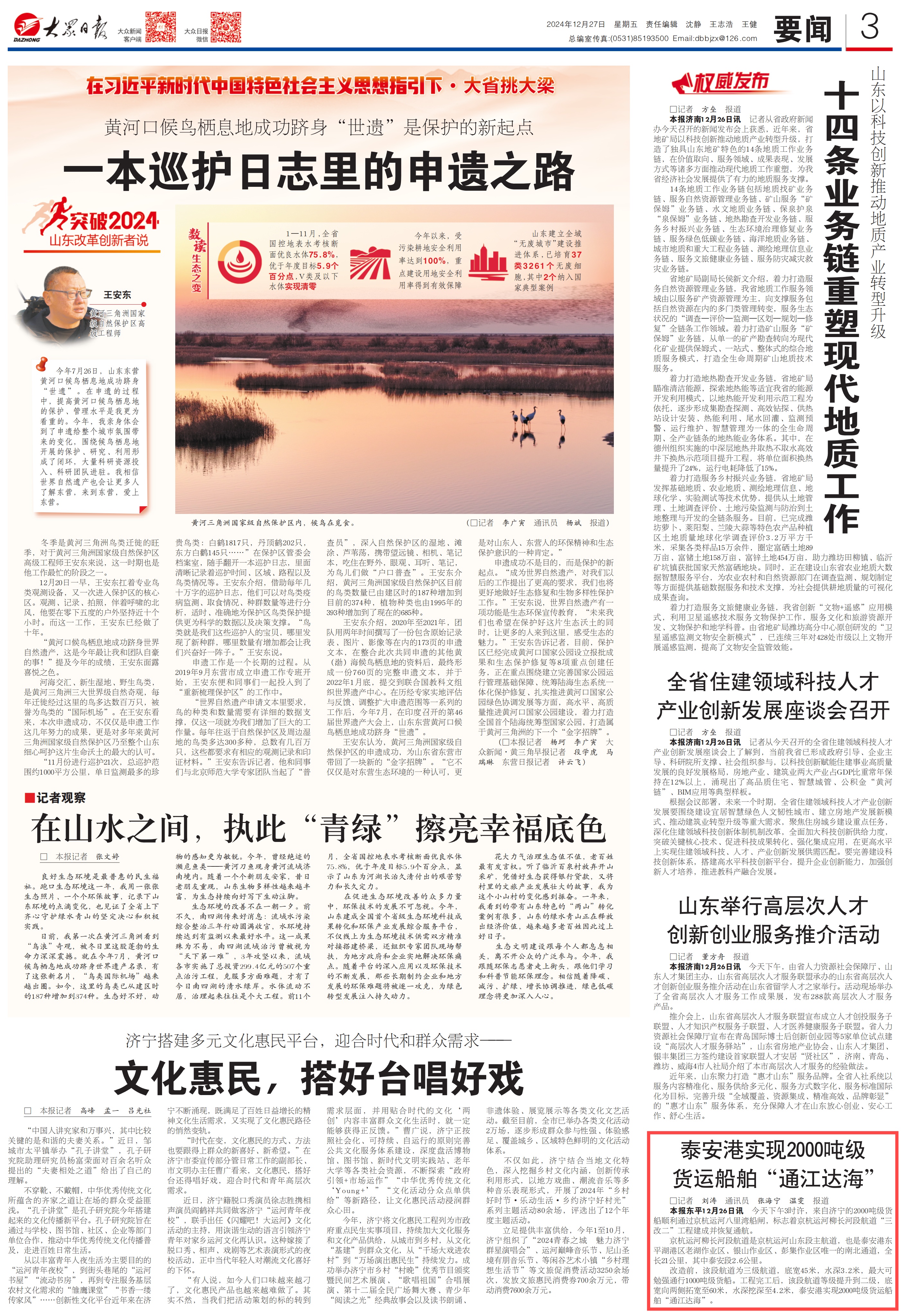 12月27日,3版要闻刊发《泰安港实现2000吨级货运船舶“通江达海”》,报道京杭运河泰安东平柳长河段航道“三改二”工程建成并恢复通航。详情点击这里——《泰安港实现2000吨级货运船舶“通江达海”》