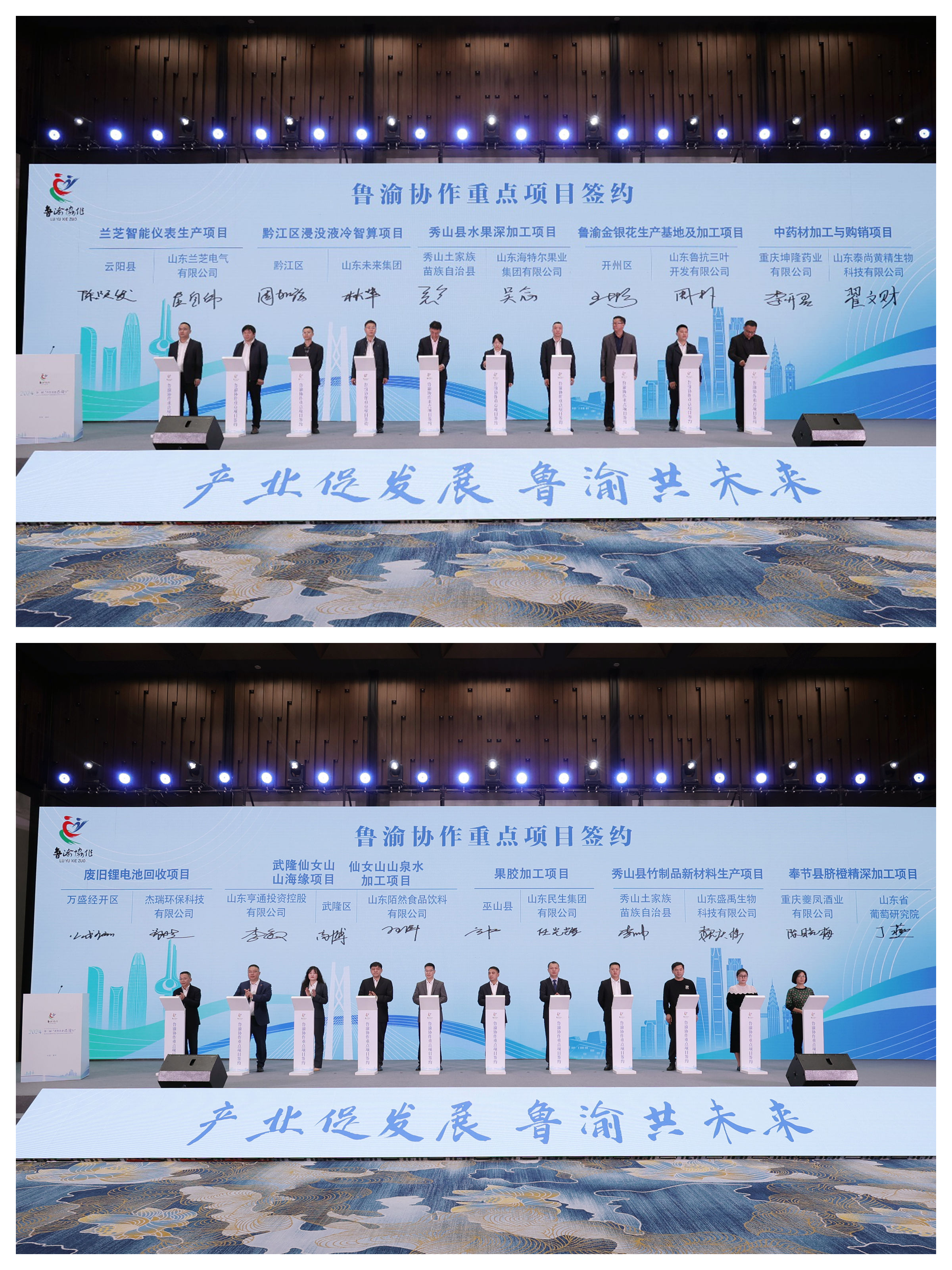 在第二届“齐鲁名企巴渝行”投资洽谈暨现代化产业体系融合发展交流活动上,就有云阳县水利局与山东兰芝电气有限公司签约兰芝智能仪表生产项目,重庆市开州区人民政府与山东鲁抗三叶开发有限公司签约鲁渝金银花生产基地及加工项目,武隆区人民政府与山东亨通投资控股有限公司签约武隆仙女山山海缘项目等25个项目现场签约,涉及农业、机械制造、生物医药、文旅等多个产业。