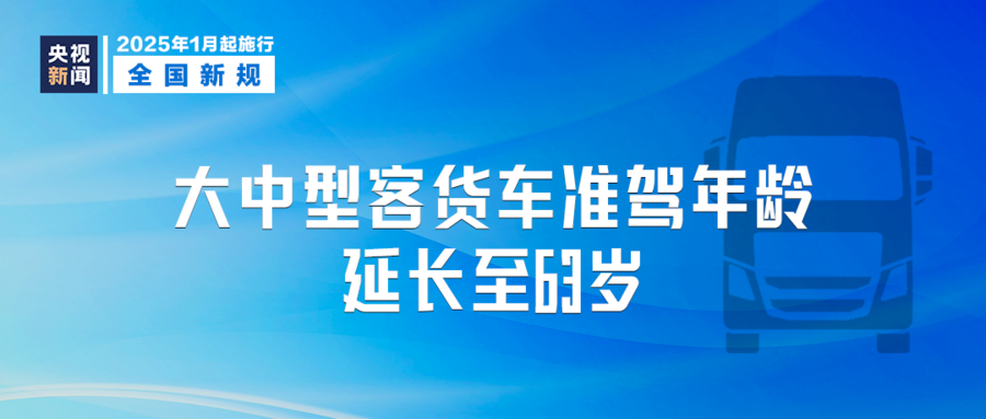 新修订的《机动车驾驶证申领和使用规定》自2025年1月1日起实施,将大中型客货车驾驶证的申请年龄上限由60周岁延长至63周岁,大中型客货车准驾车型的年龄上限由60周岁延长至63周岁。