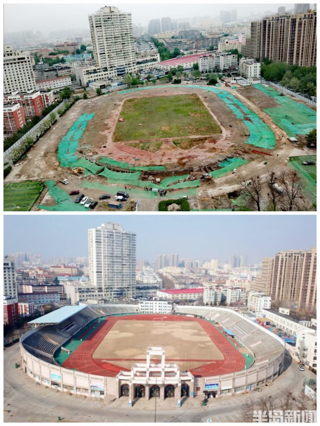 弘诚体育场,青岛市民无人不晓,它位于市北区康定路10号,前身是青岛第三体育场(亦称海泊河体育场),始建于1996年,2008年全运会前夕曾进行过一次整修。弘诚体育场是我市重要体育基础设施,由于经过多年使用,弘诚体育场外观陈旧,场地设施破损严重,已不能满足群众公共体育需求,再加上老四方区域没有规模较大、符合现代化标准的全民健身场馆,弘诚工作人员正在操场上进行收尾工作