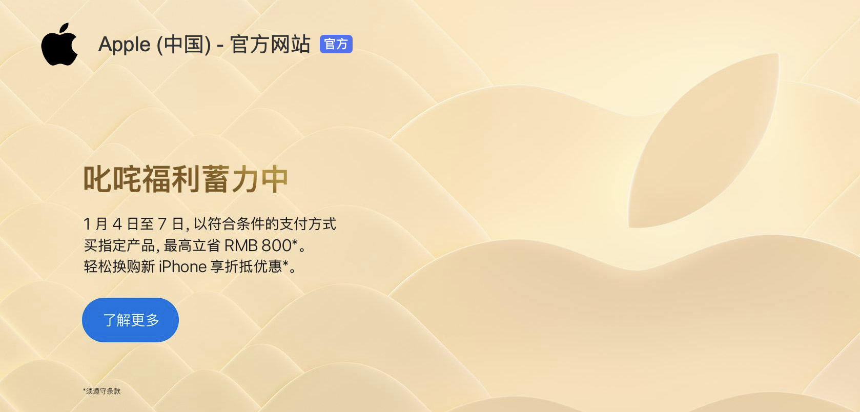 元旦刚过,苹果中国官网公布出了“叱咤福利”新年促销活动,将于1月4日-7日开启。