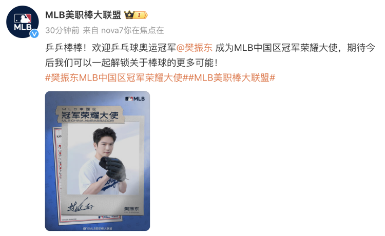 1月2日,@MLB美职棒大联盟 发文欢迎乒乓球奥运冠军樊振东成为MLB中国区冠军荣耀大使。