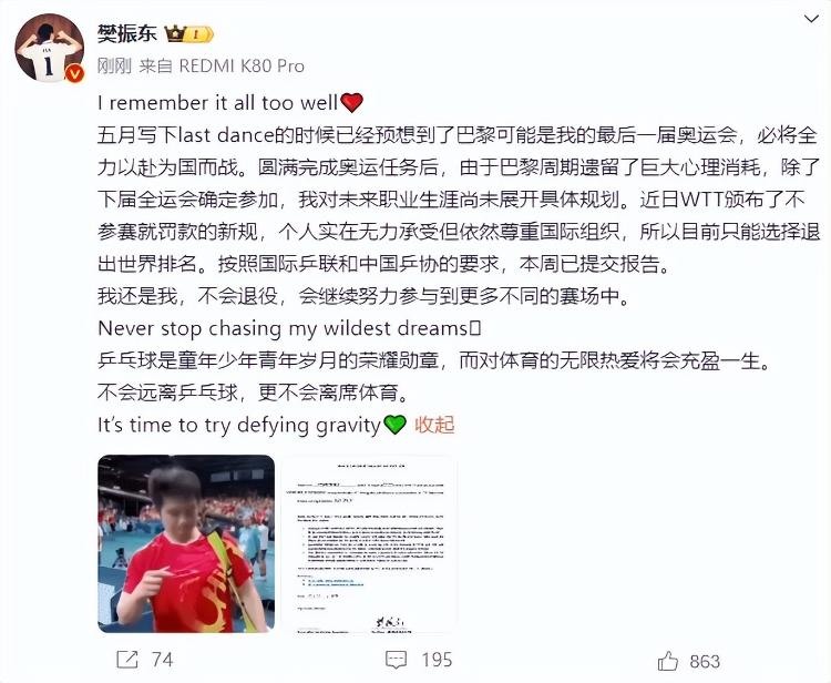 “我还是我,不会退役,会继续努力参与到更多不同的赛场中。乒乓球是童年少年青年岁月的荣耀勋章,而对体育的无限热爱将会充盈一生。不会远离乒乓球,更不会离席体育。”