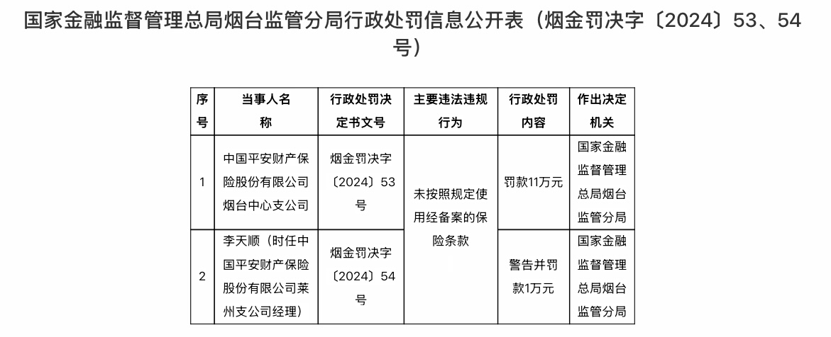 中国平安财产保险股份有限公司烟台中心支公司“未按照规定使用经备案的保险条款”,被烟台监管分局罚款11万元;