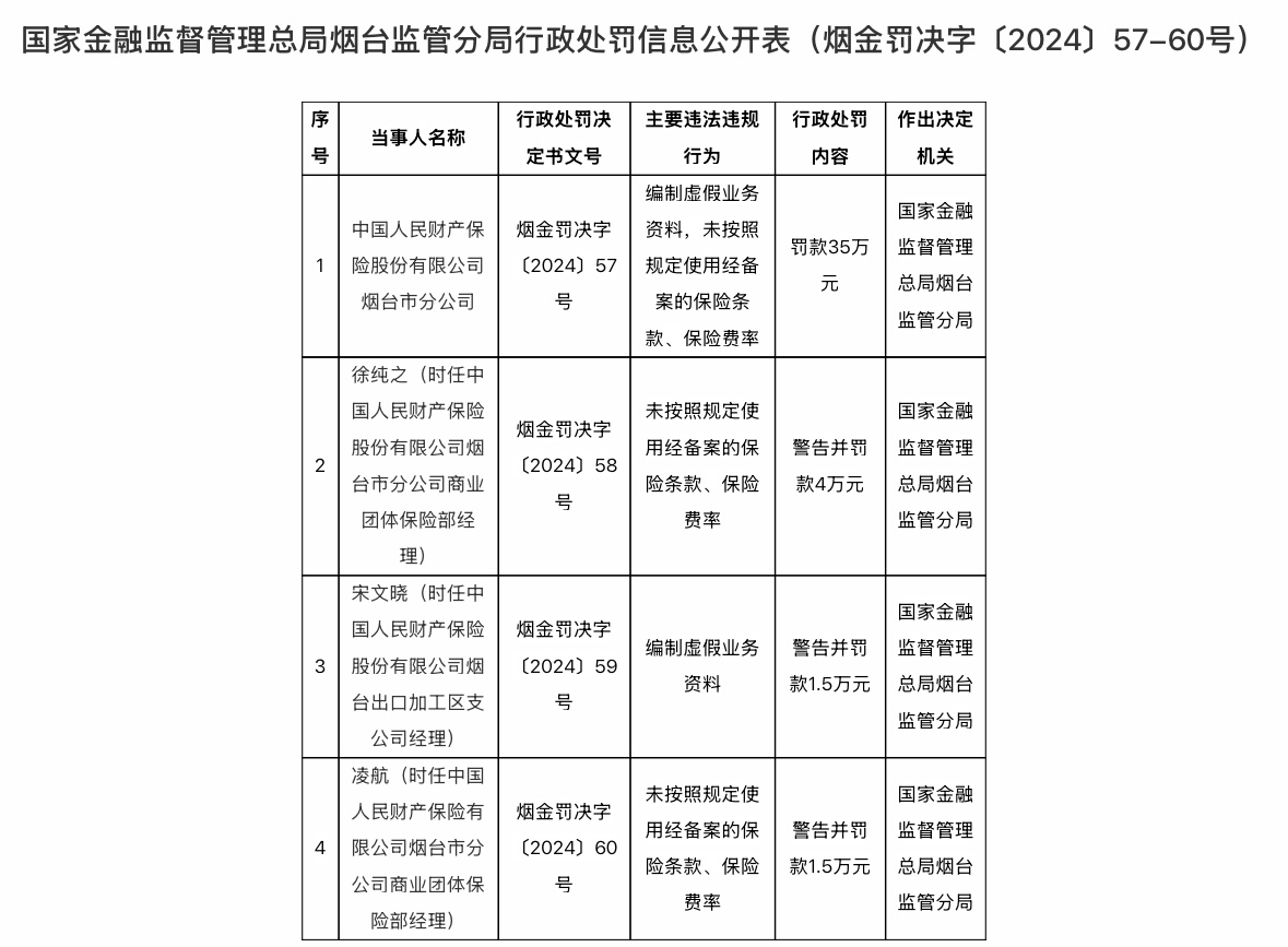 中国人民财产保险股份有限公司烟台市分公司“编制虚假业务资料,未按照规定使用经备案的保险条款、保险费率”被烟台监管分局罚款35万元;