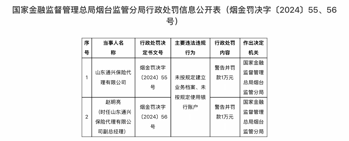山东通兴保险代理有限公司“未按规定建立业务档案、未使用银行账户”被烟台监管分局警告并罚款1万元;