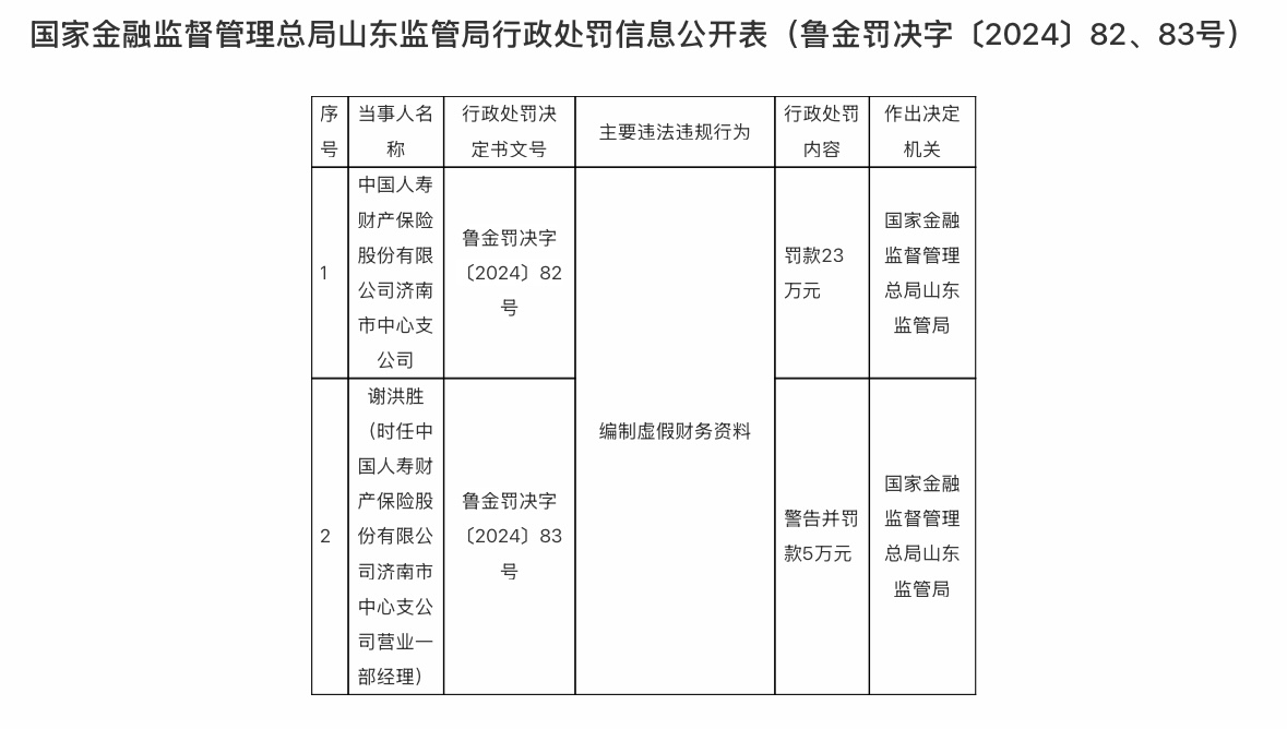 中国人寿财产保险股份有限公司济南市中心支公司“编制虚假财务资料”被山东监管局罚款23万元;