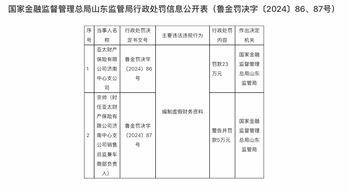 亚太财产保险有限公司济南中心支公司“编制虚假财务资料”被山东监管局罚款23万元;